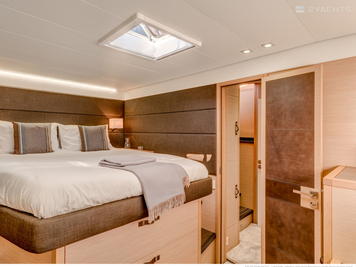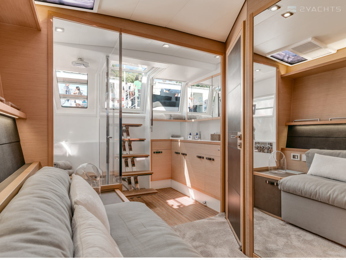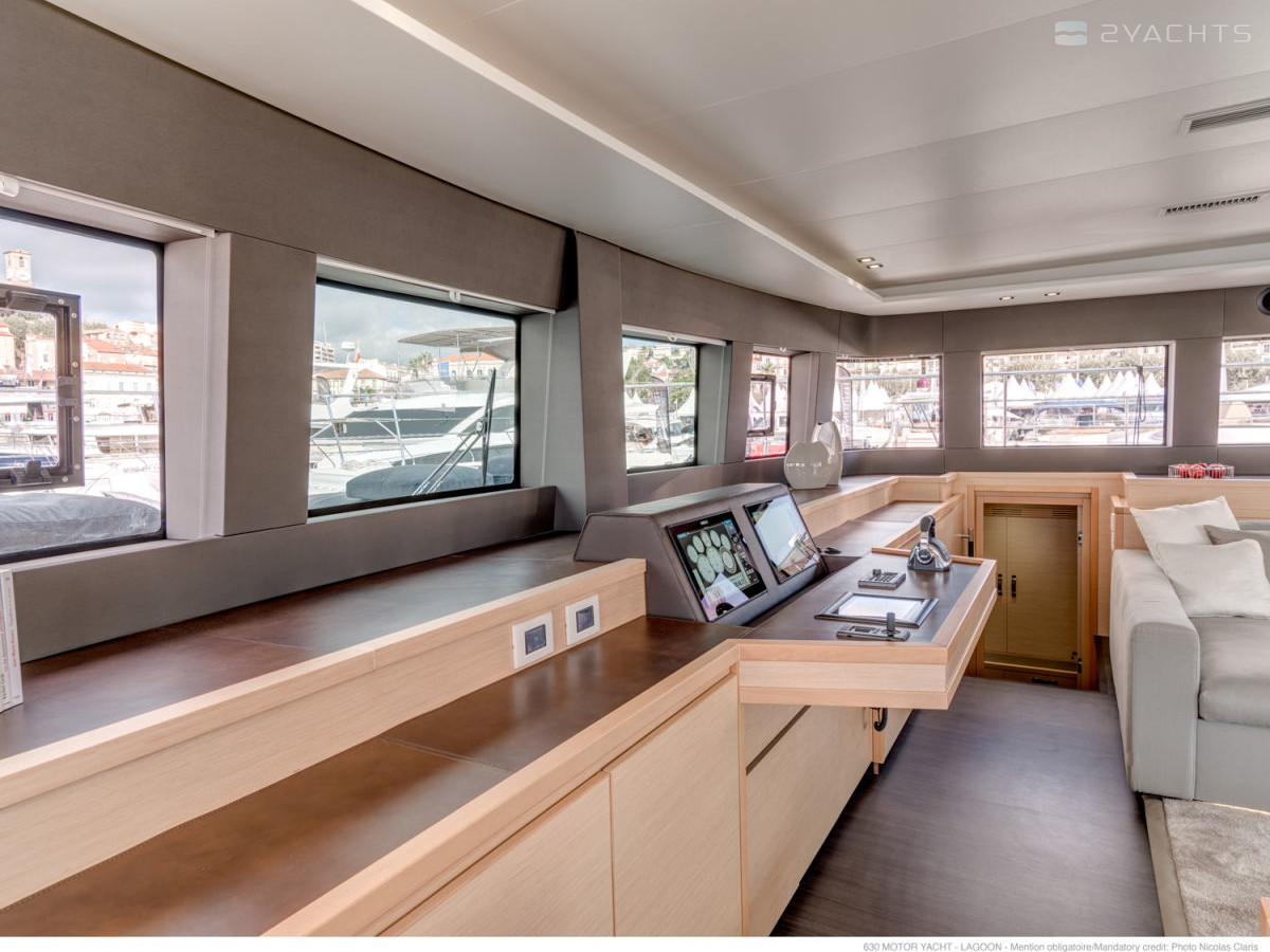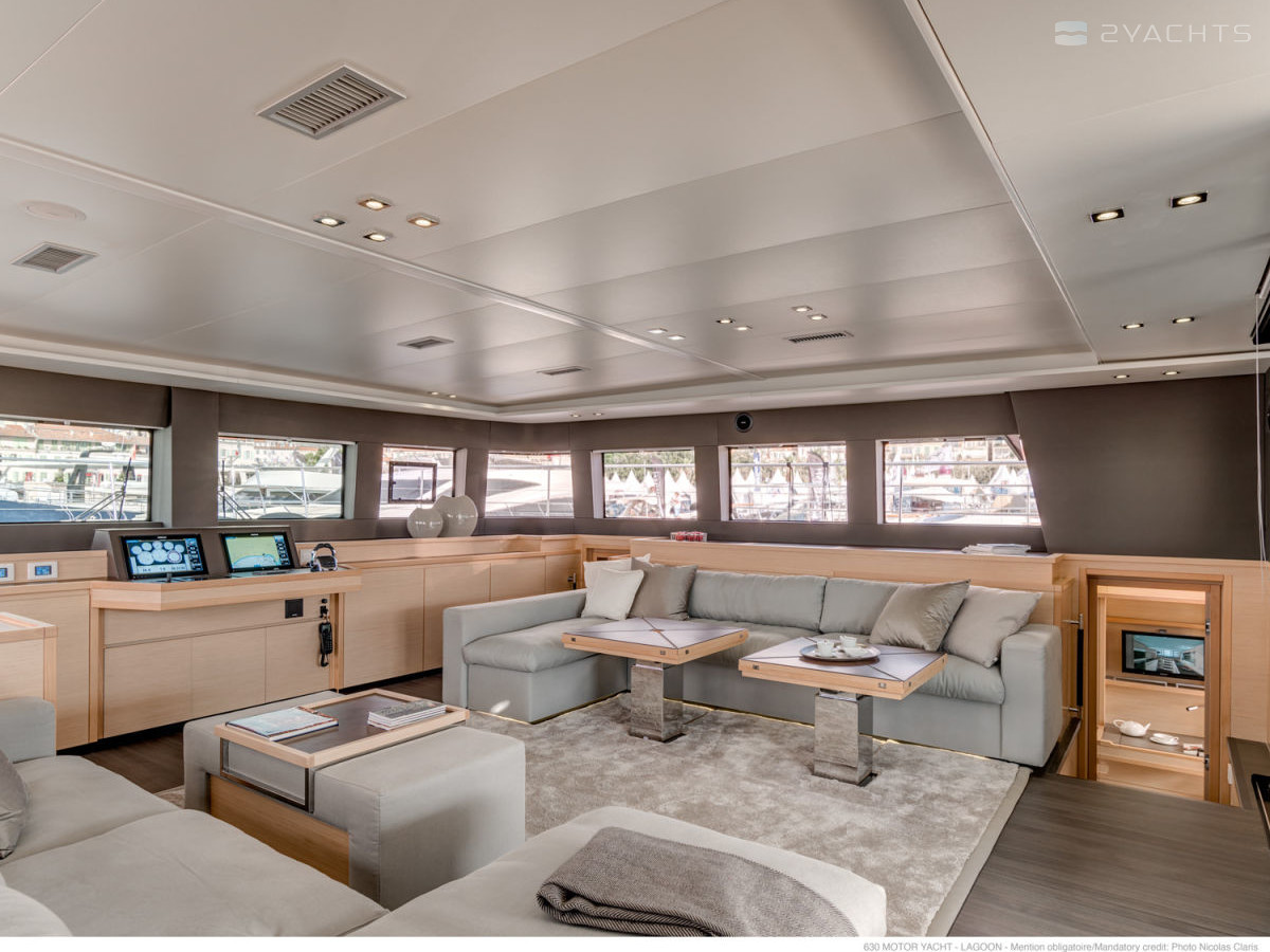 The Lagoon 630 MY stern is equipped with two platforms with removable ladders for access to the water and a tow bar. Inside the cockpit, there are two soft corner sofas with compact tables and several armchairs, an electronic control panel with a desk, and on the sides there are doors leading to the ship's cabins.