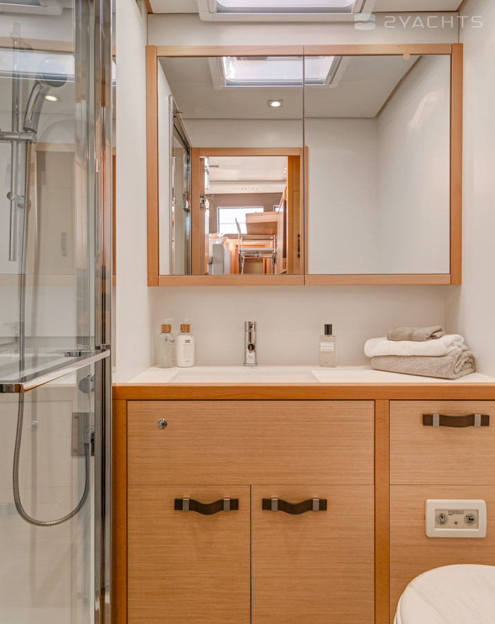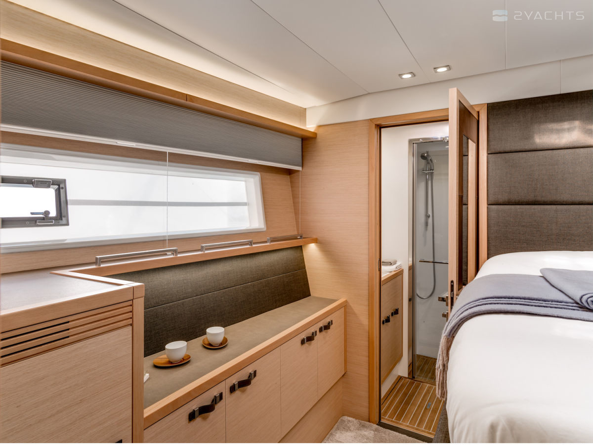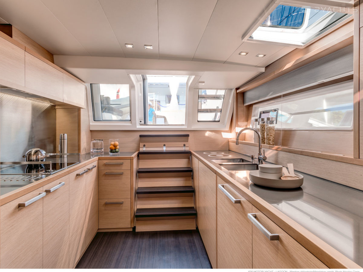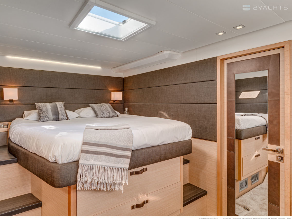 The Lagoon 630 MY stern is equipped with two platforms with removable ladders for access to the water and a tow bar. Inside the cockpit, there are two soft corner sofas with compact tables and several armchairs, an electronic control panel with a desk, and on the sides there are doors leading to the ship's cabins.