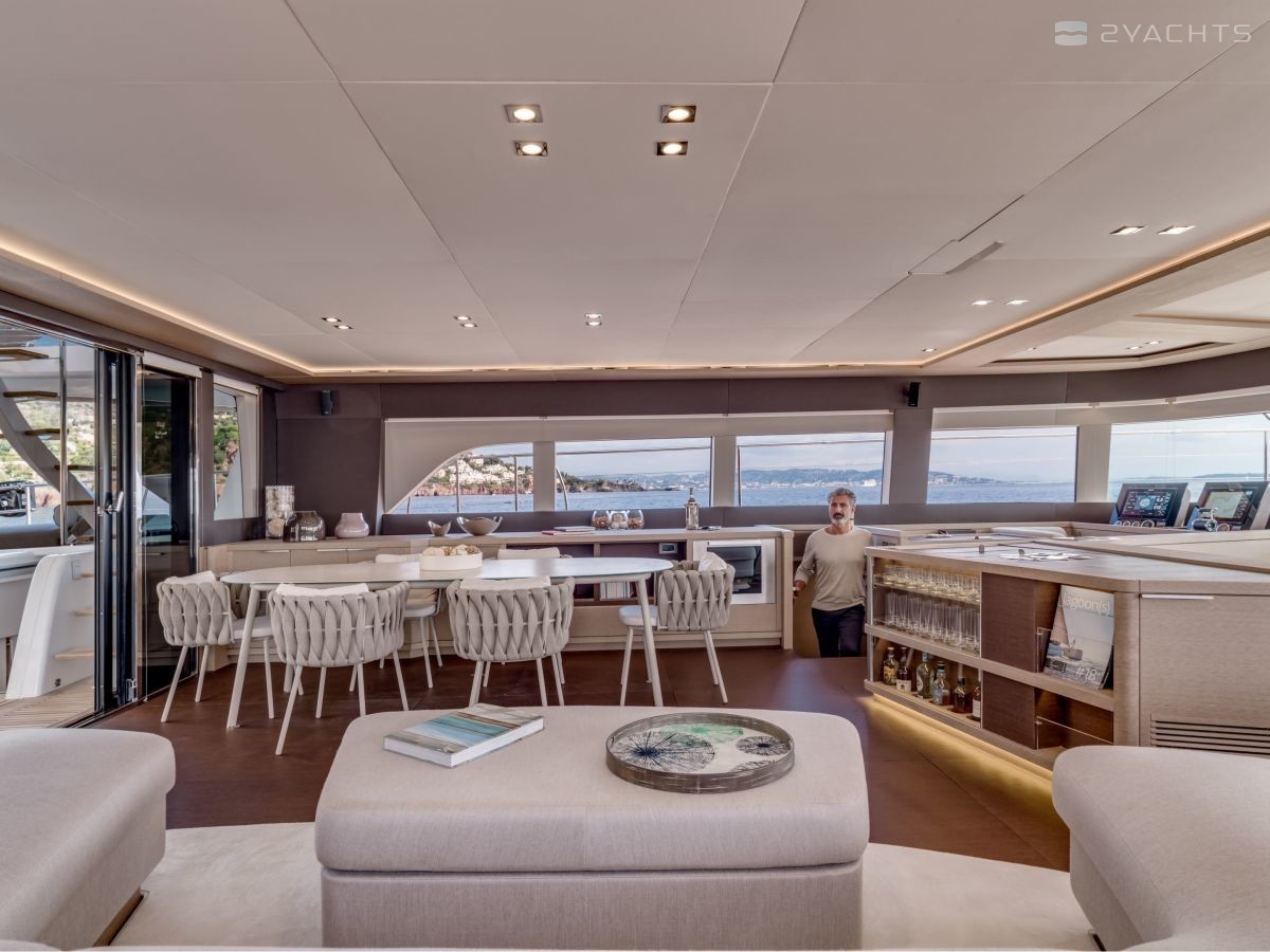 On the cockpit of the model there is a cockpit with a hard roof, equipped with an observation post with a control panel, a soft corner sofa, several armchairs and a sunbed. The outer cockpit deck is equipped with two corner sofas, sun loungers, a wooden table, a galley with grill and sink, and an aerator. At the stern, there are two platforms for access to the water, equipped with folding ladders and metal handrails. Along the sides of the Lagoon SEVENTY 8, there are walkways with metal railings that lead to the bow platform, equipped with several sun loungers.