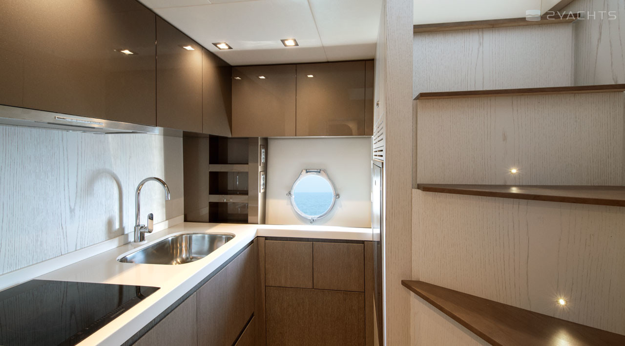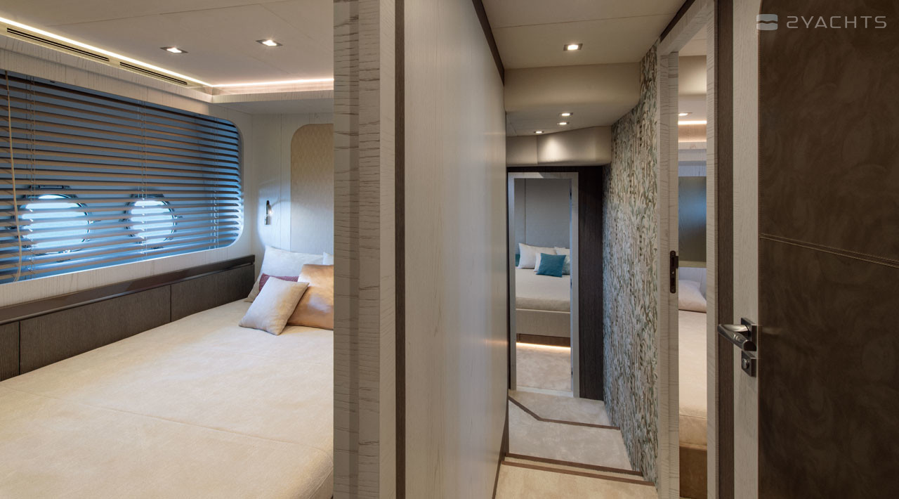 Innovative solutions include wide side walkways protected by bulwarks. The flybridge is protected by a hardtop, and its central zone is able to turn into a huge couch. Lightweight fast-mounted tent on carbon supports allows you to organize a secluded living room in the bow. The ship's configuration provides for two layout options - three or four cabins with their own bathrooms, a galley on the lower or upper deck.