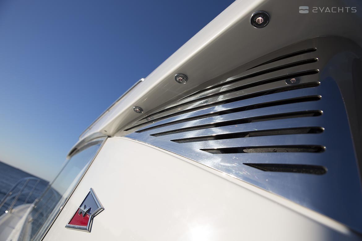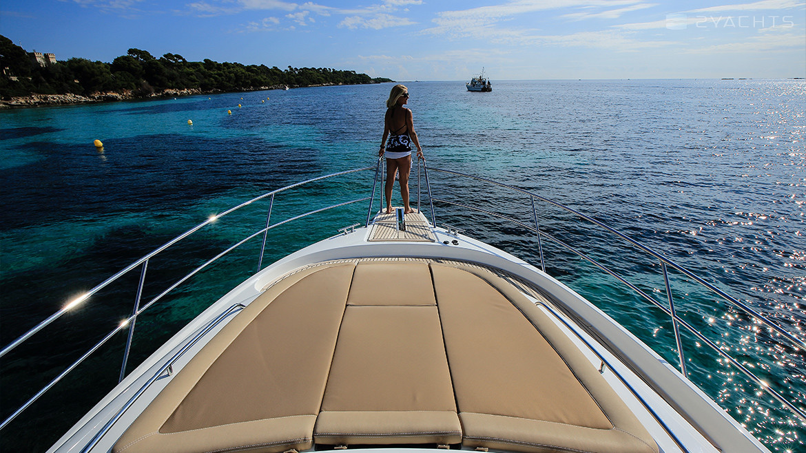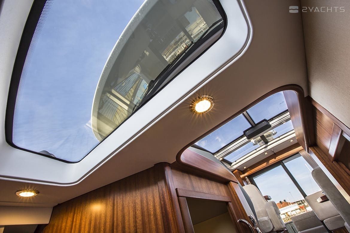 The asymmetric layout of the Sidewalk deck is similar to the 305 and 365 models. The aft lounge area is protected by a folding awning, the table is transformed into a sunbed, and the cabin has a galley, a dining room and a control room. The side sliding door allows the captain to independently moor and maneuver. The dashboard features dual 12-inch Simrad touch-sensitive plotter cards, a steering stick, an on-board computer and Volvo Penta spoilers. The visibility in any weather is provided with frontal glazing with anti-reflective coating and wipers with a large cleaning area. The glass section on the roof with integrated blinds is electrically movable. The galley is equipped with a hood above the stove, all other equipment is chosen by the owner. Rear deck flush with bathing platform and saloon.