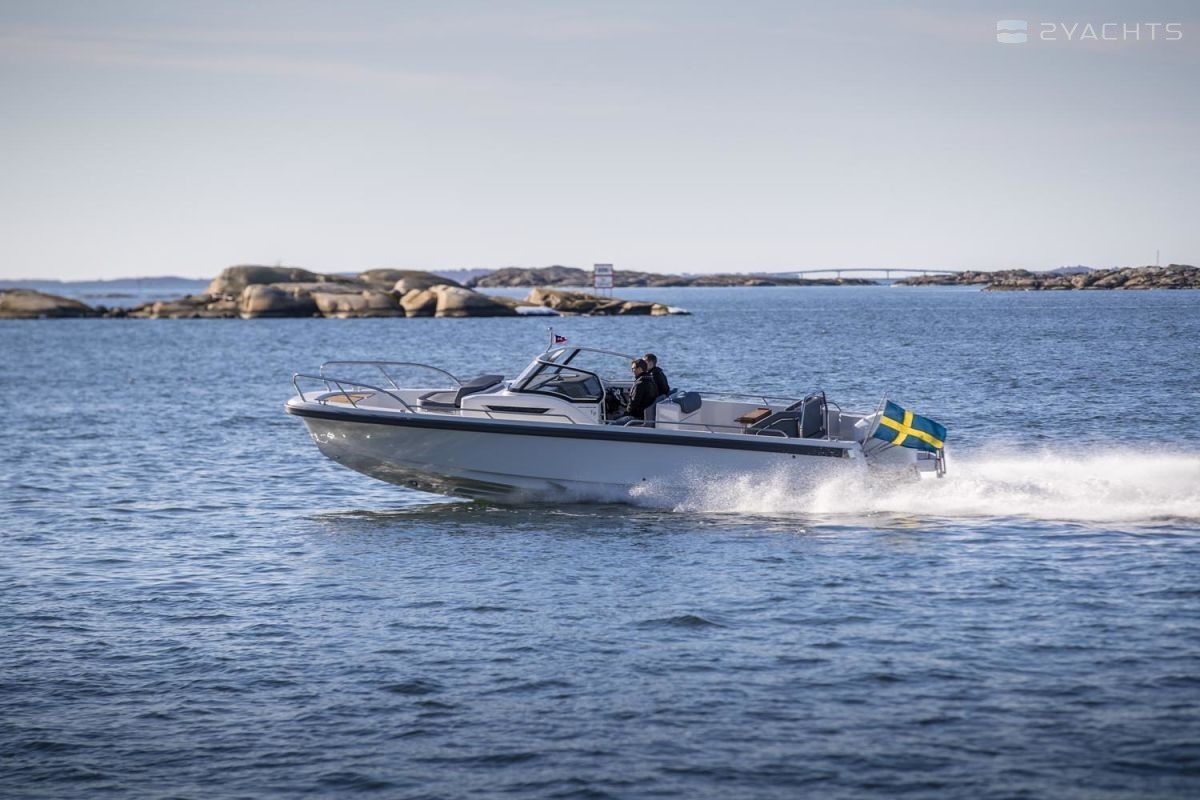The boat is created on a stepped hull of Weekender 9, which allows you to reach speeds from 20 to 40 knots and choose an engine: outboard Cold Fusion or stationary Mercury Verado or Volvo Penta with a power of 300-350 hp