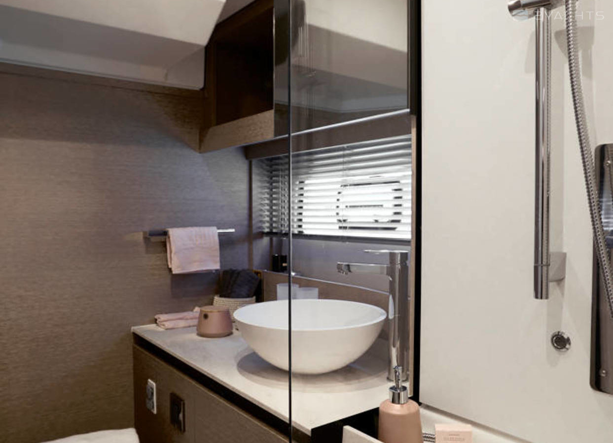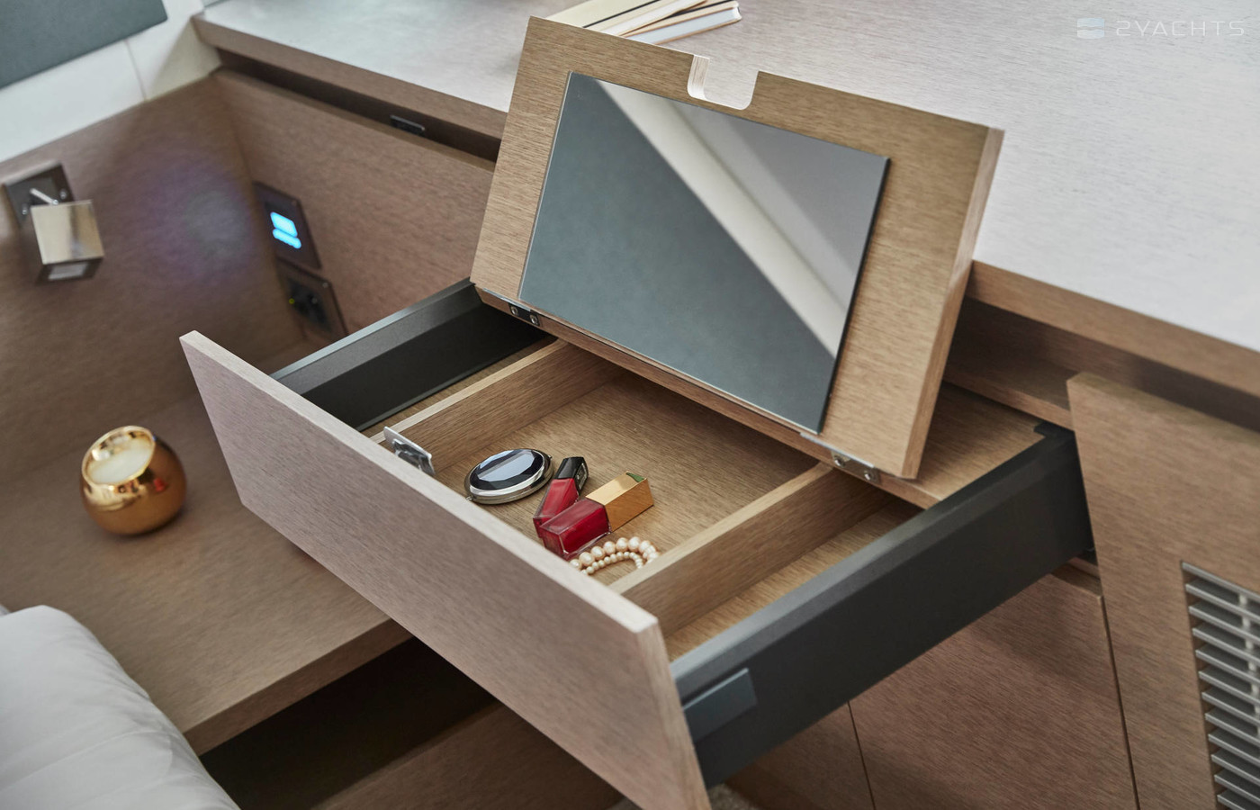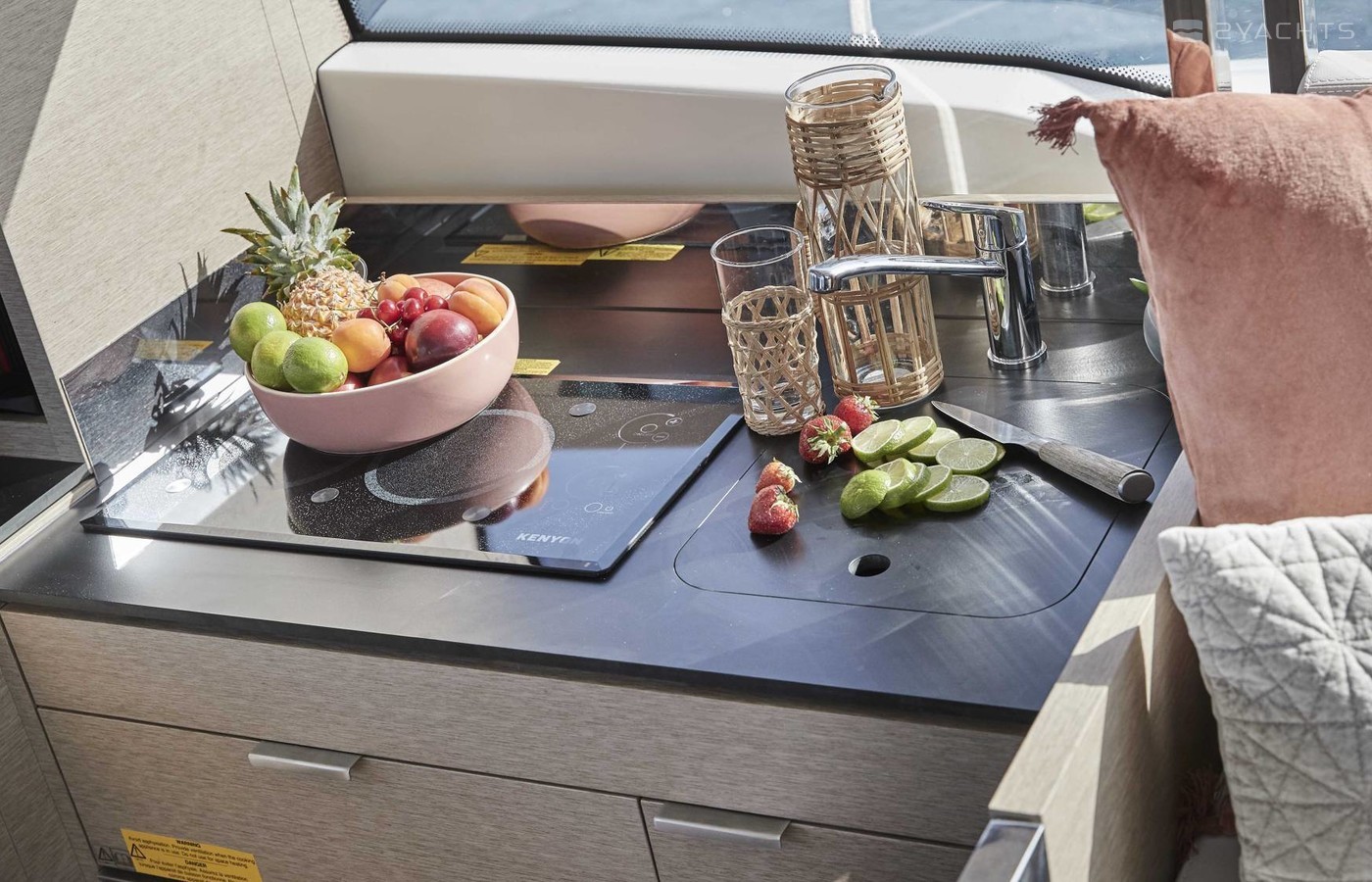 Standard equipment PRESTIGE 420 engines Cummins 6.7 - 380 CV / HP - V-drive or Cummins 6.7 - 425 CV / HP - V-drive allows it to develop a cruising speed of 22 knots. The maximum speed is 31 knots. The fuel supply in tanks is 1100 liters, and fresh water is 400 liters. The vessel is intended for sea voyages at a distance from the coastline of not more than 200 miles.