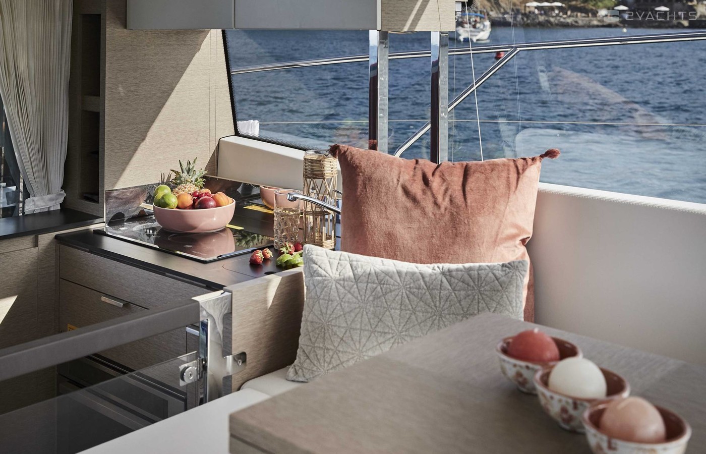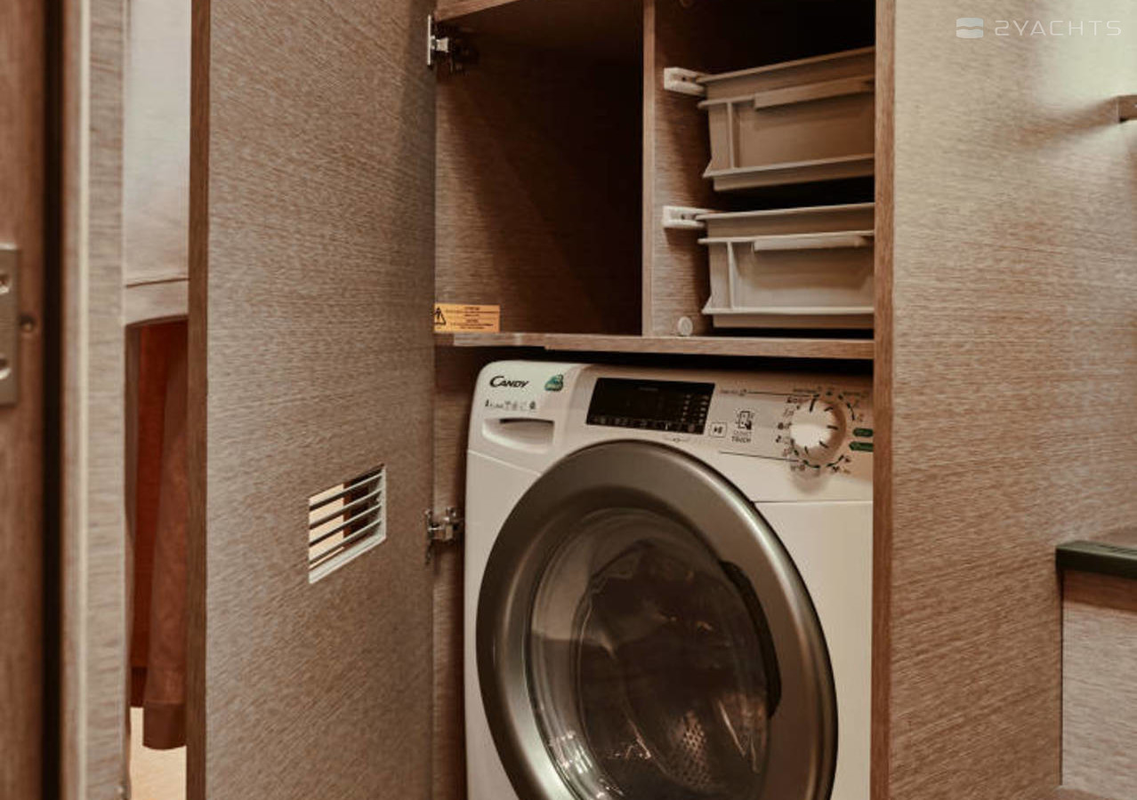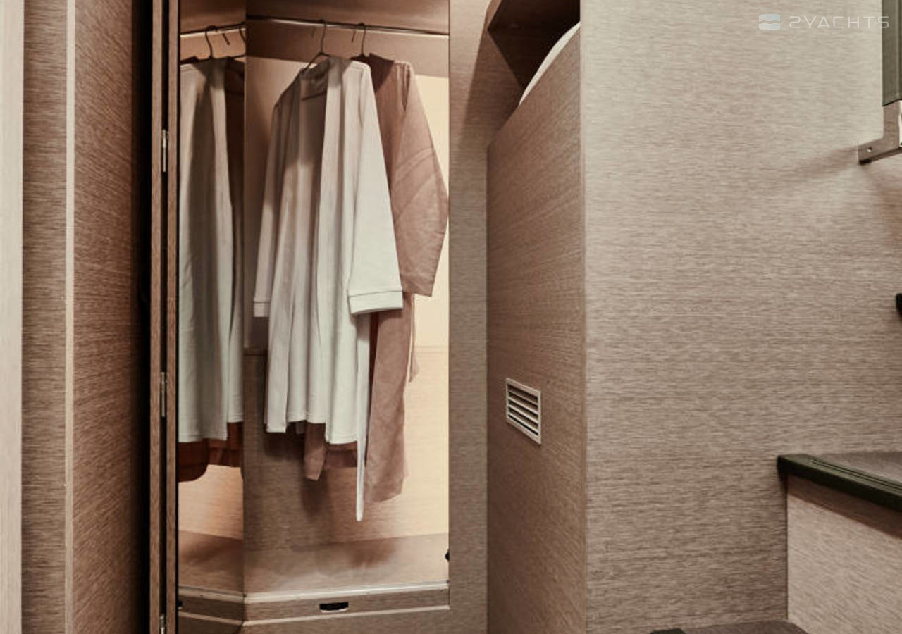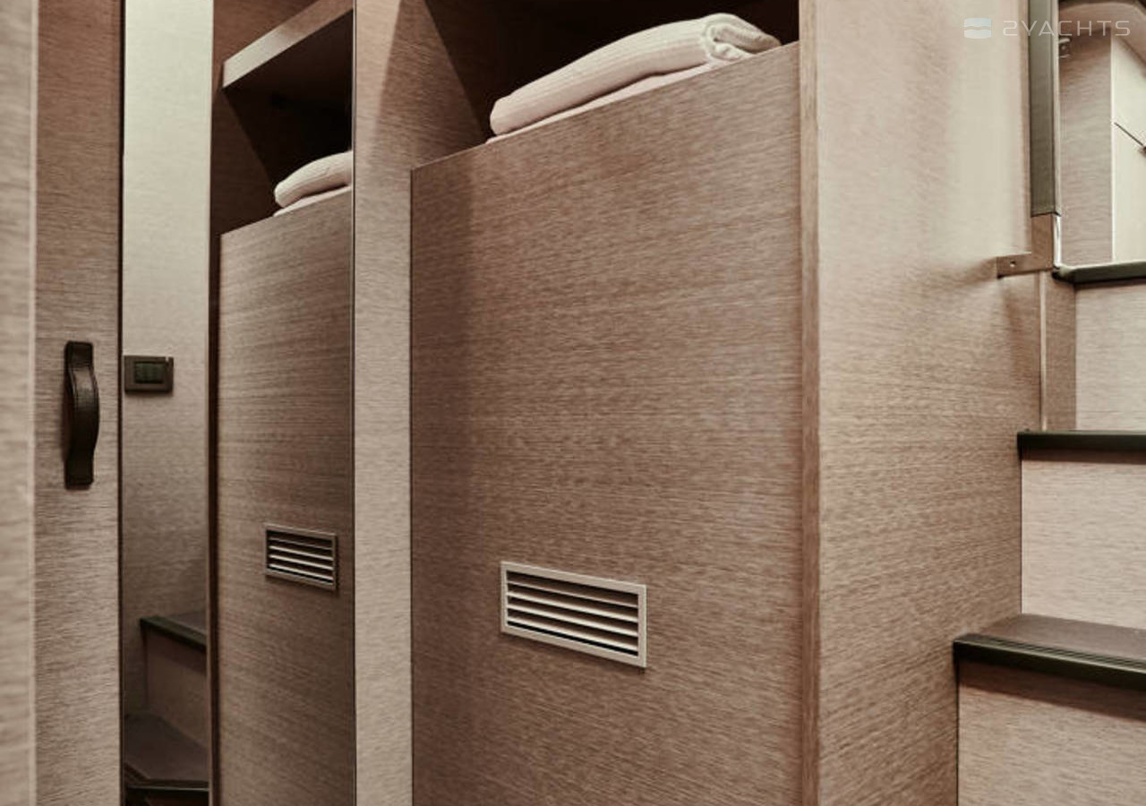 On the middle deck there is a lounge with panoramic glazing, sofas, a galley, a bar, a main control room, a ramp leading to the flybridge. The space behind the cabin, on the cockpit is formed by a sofa and a table, as well as a bathing platform. There is also a garage for a jet ski or a tender.