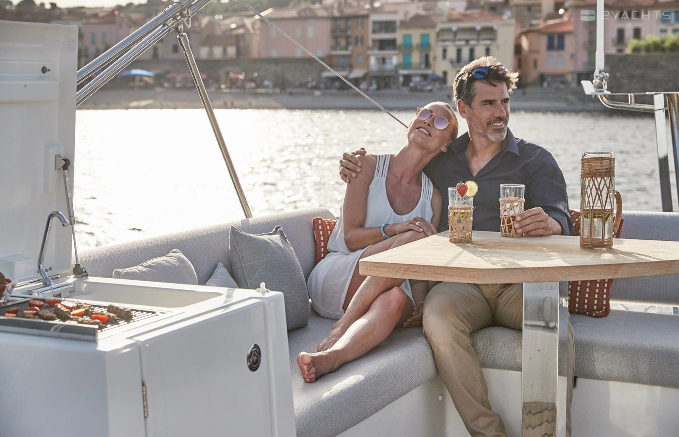 On a flybridge with stainless steel fences, there is a control room with a steering wheel chair, a sunbed, a table, a corner sofa and a sunbathing area in the bow. There is also a small galley with an induction hob, a sink and a refrigerator.