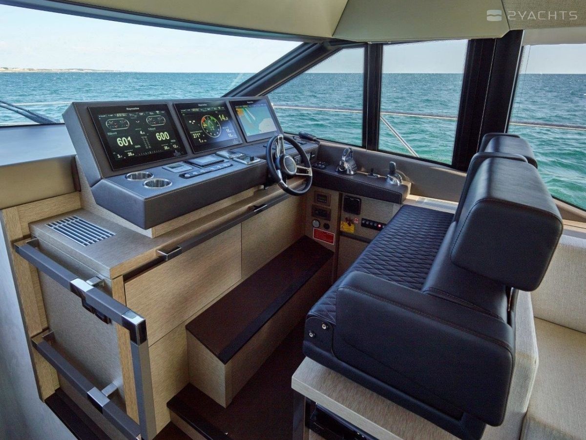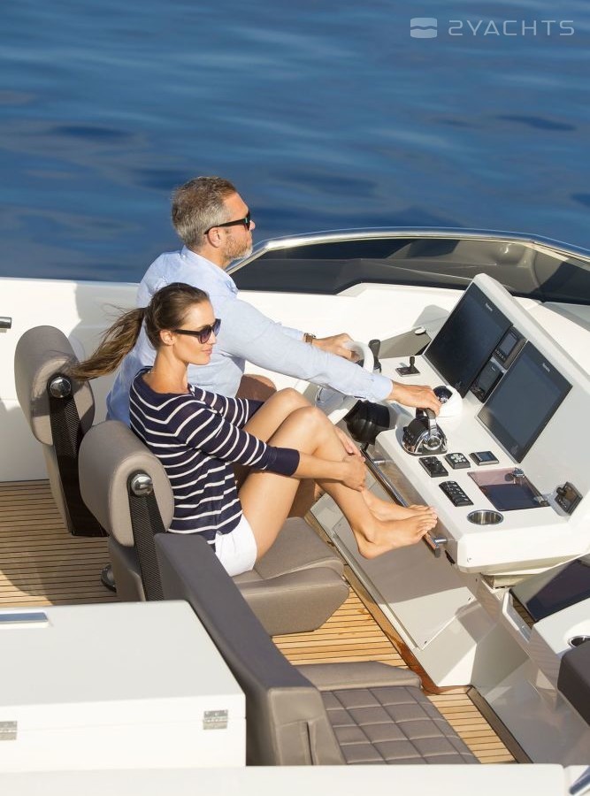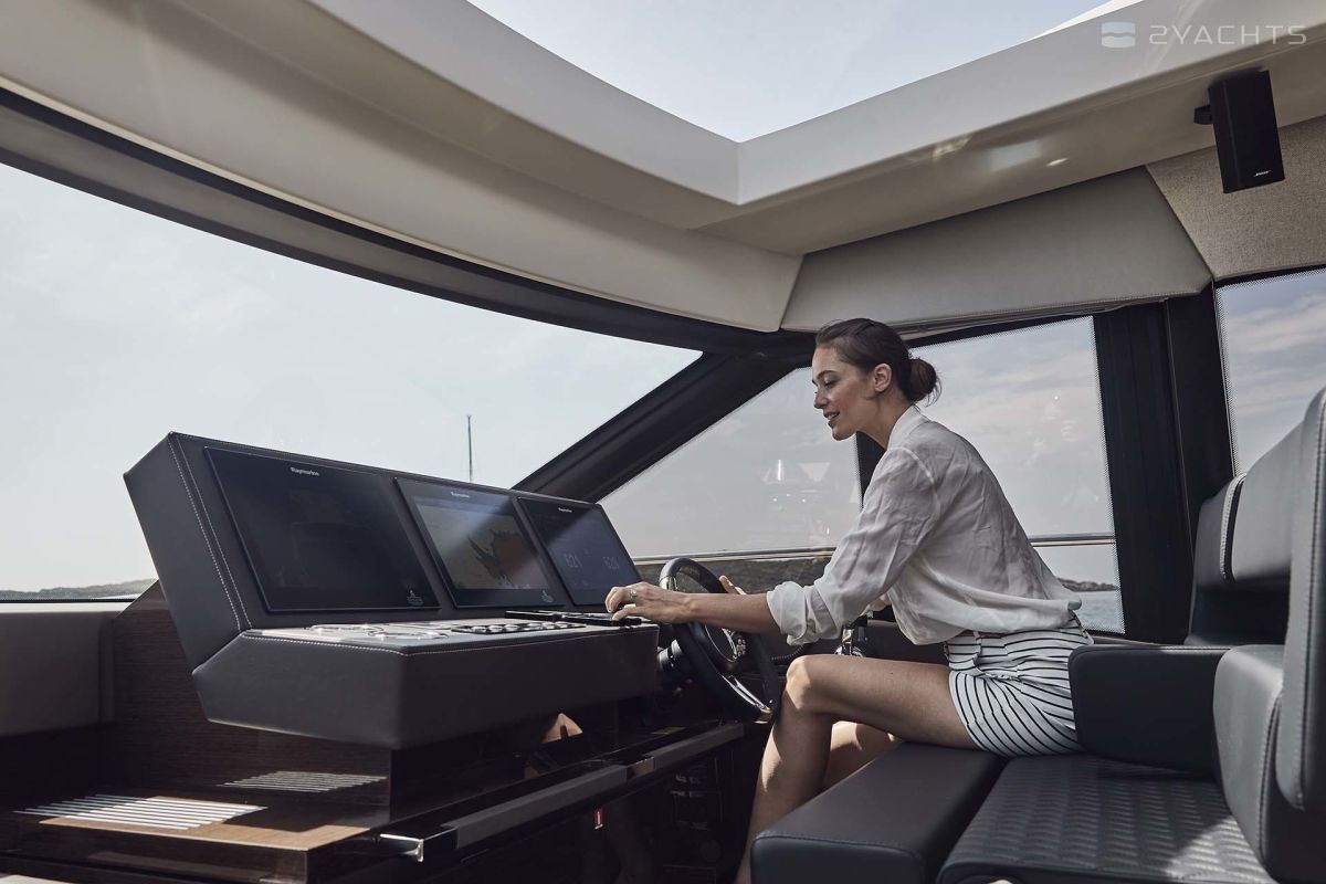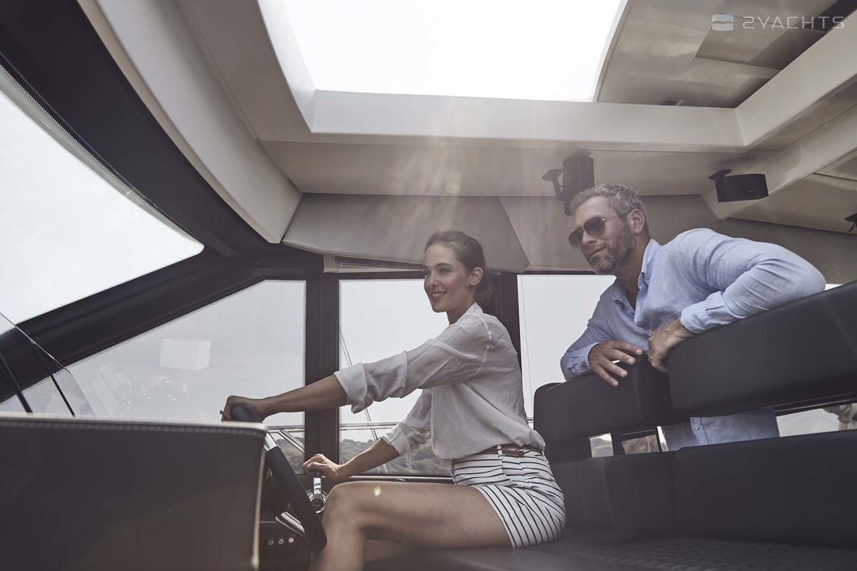 The sports flybridge is equipped with a sliding glass sunroof, a full-fledged control post and a luxurious U-shaped sofa for relaxing and sunbathing.