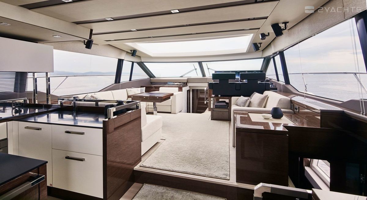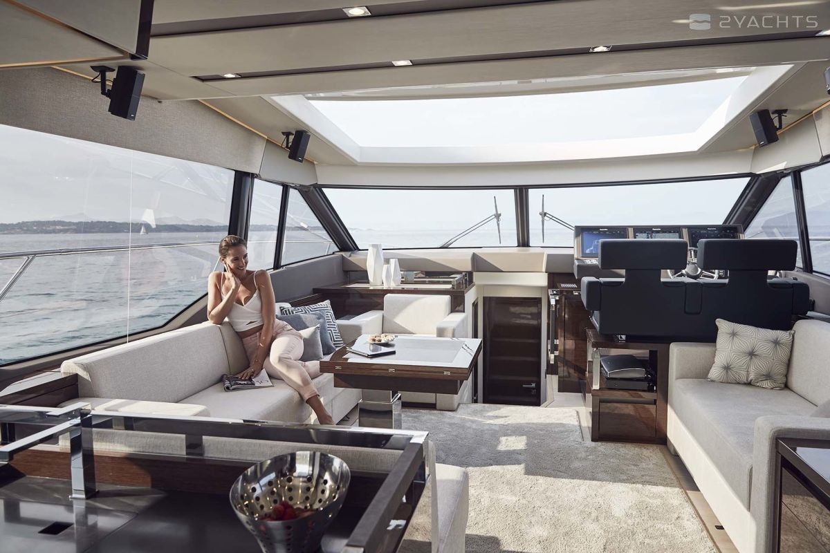Accurate layout of the cabin and a wide panoramic view due to the large area of panoramic glazing and a transparent hatch turn the cabin into a terrace and instantly transforms the space of the yacht PRESTIGE 630S.