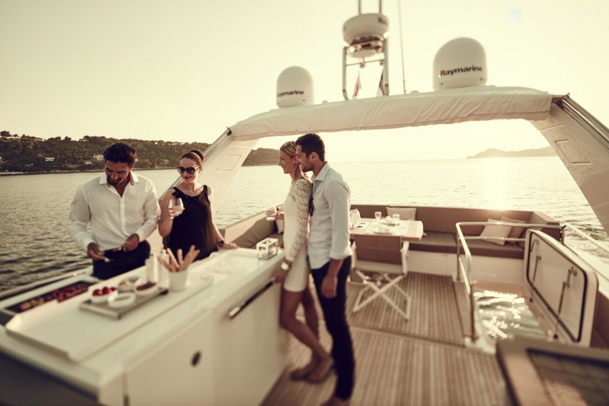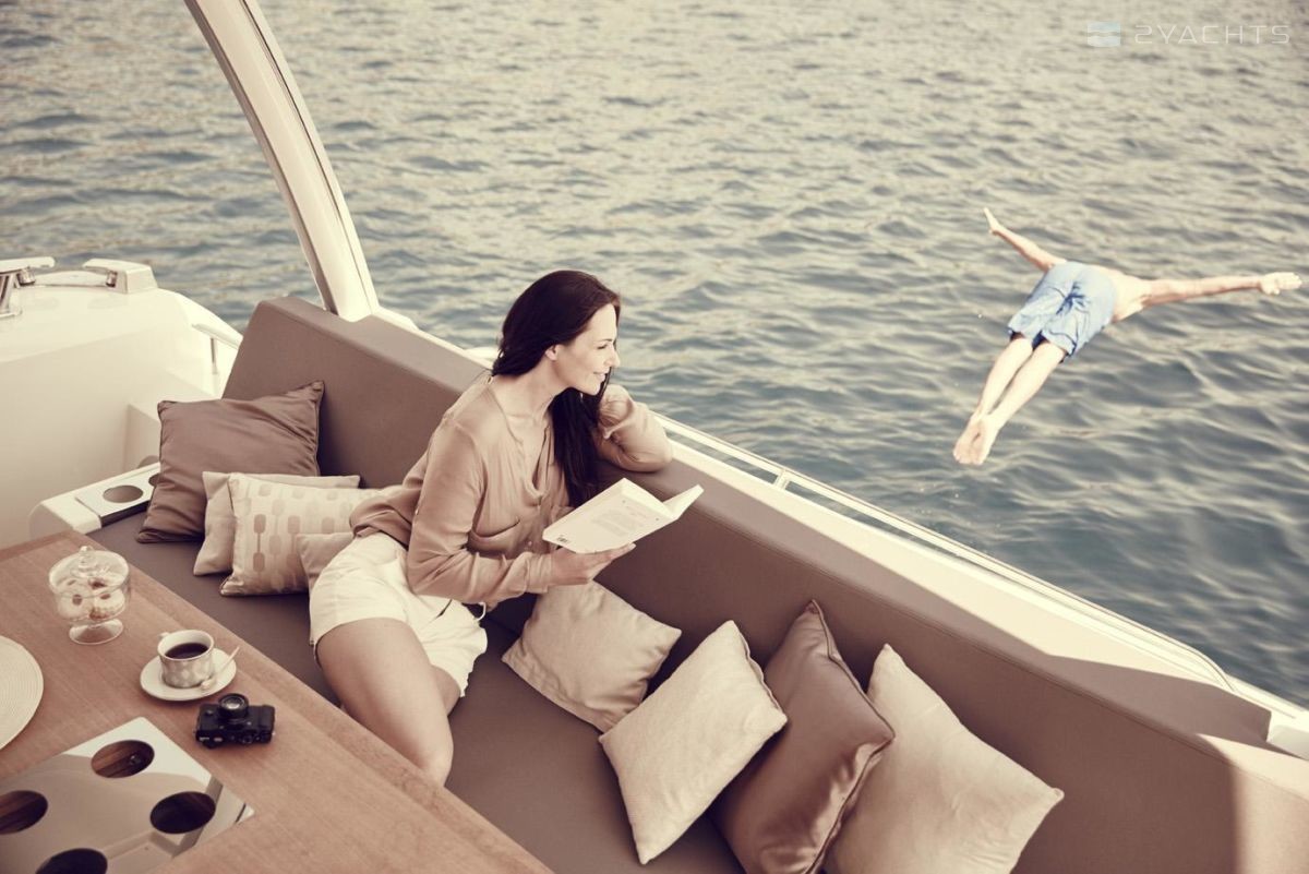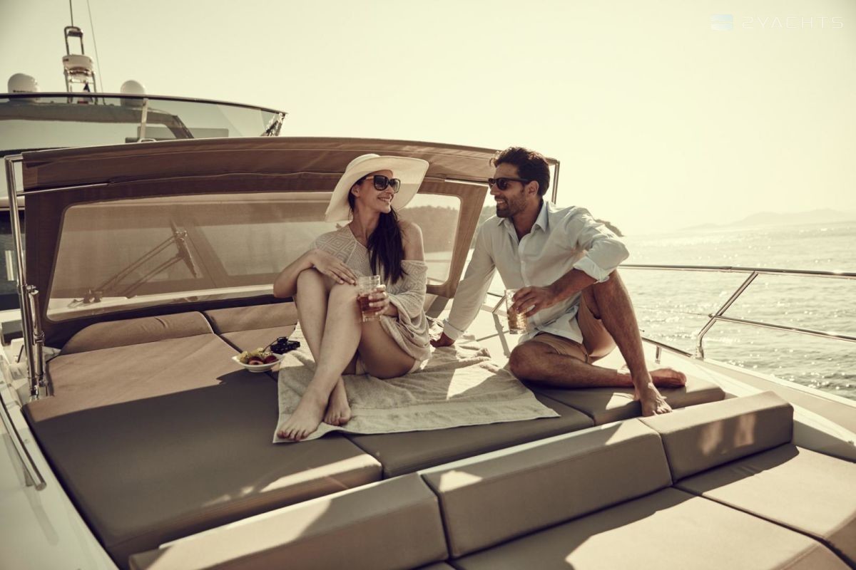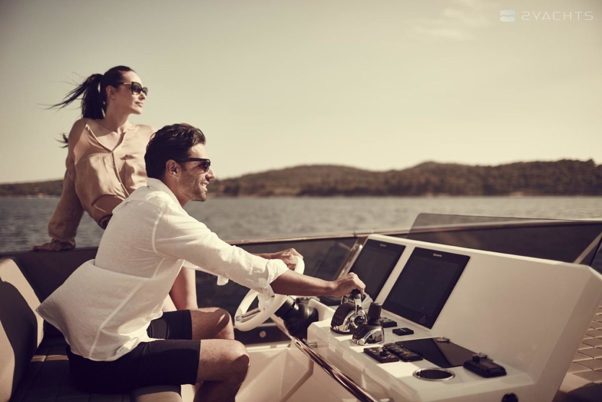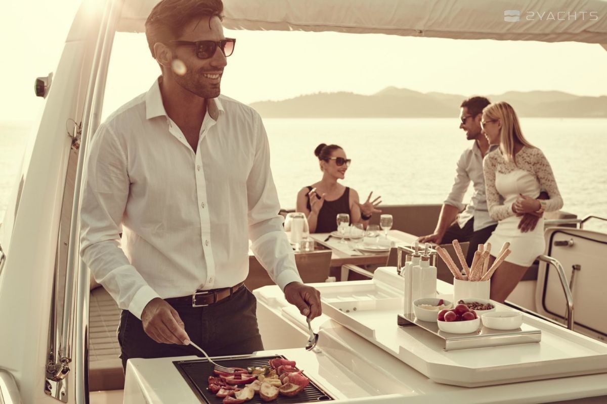 Particular attention is paid to outdoor recreation - the flybridge is equipped with spacious sofas, deck chairs, a bar with a refrigerator and a full-fledged control post.