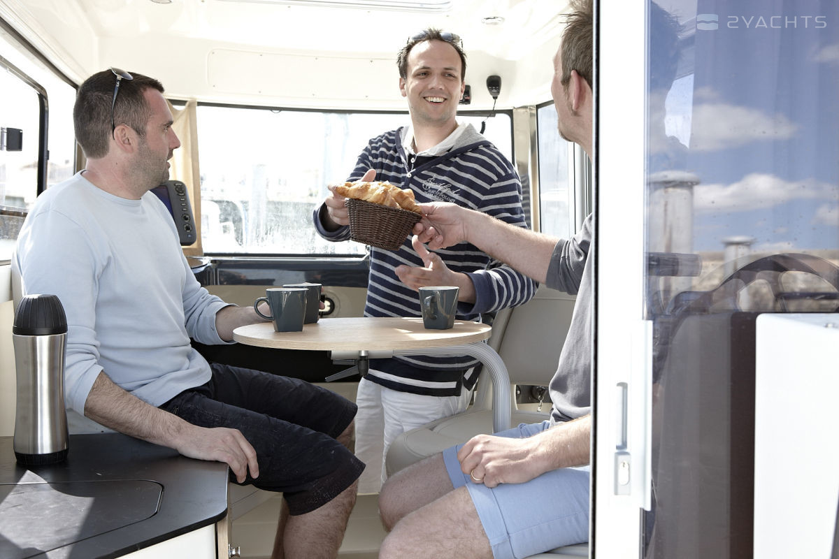 On the cockpit of the boat is a sofa, holder for fishing rods and a self-draining system. The control station located in the wheelhouse is equipped with an adjustable seat, speedometer, tachometer, steering wheel with hydraulic booster and fuel level sensor. A 12-volt outlet is provided for connecting external devices, and a special button for emergency engine shutdown. Cabin Quicksilver 755 Pilothouse is equipped with berths, opening portholes, a lighting system and carbon monoxide sensors, a bathroom. The galley is equipped with a gas stove, sink with faucet, refrigerator and work desk. An additional table can be installed in the wheelhouse and on the cockpit. As an option, a sliding glass sunroof and aft shower can be installed.