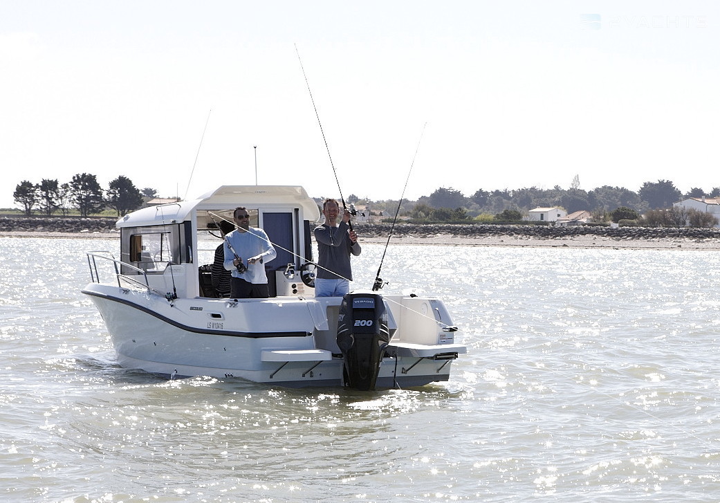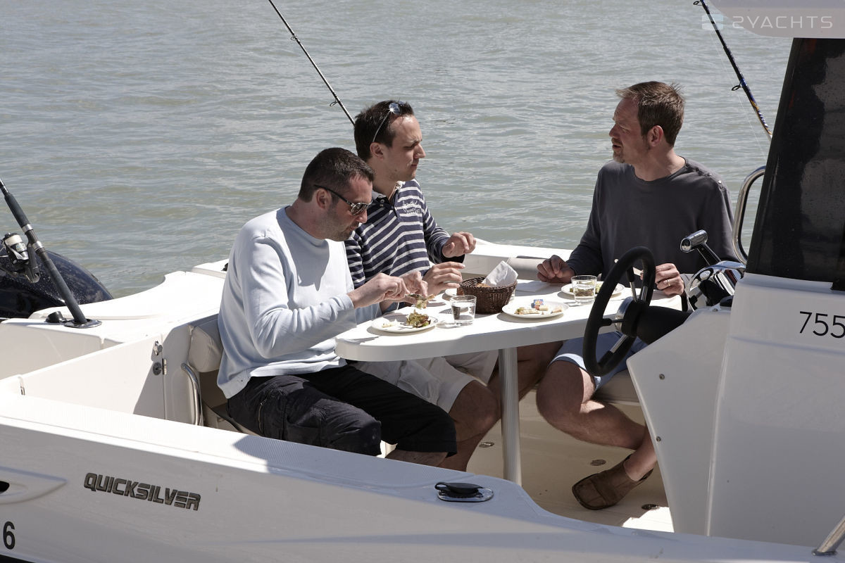 At the request of the customer Quicksilver 755 Pilothouse can be equipped with several options for outboard motors. Mercury V6 at 175, 200 or 225 bhp A Mercury V8 engine with a capacity of 250 hp can be installed. The capacity of the fuel tank is 300 liters, the supply of clean water is 82 liters.