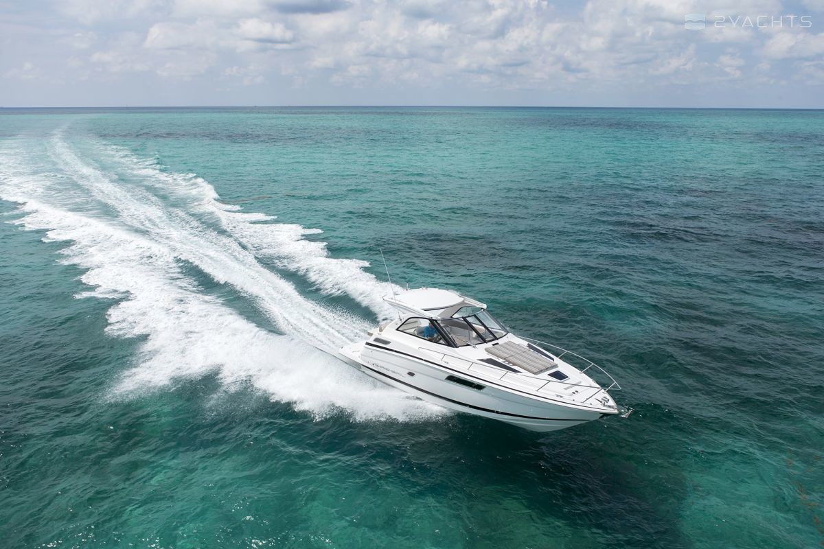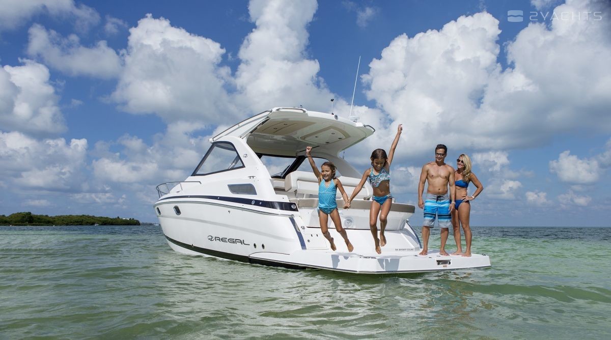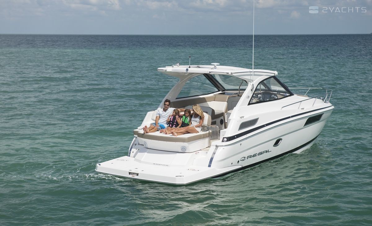 The yacht with a hardtop and half-closed saloon Regal 35 Sport Coupe was first introduced by an American shipyard in 2013. A motor vessel 11.23 m long with a draft of 0.50 m has a gliding type of fiberglass hull made using the FasTrac technology.