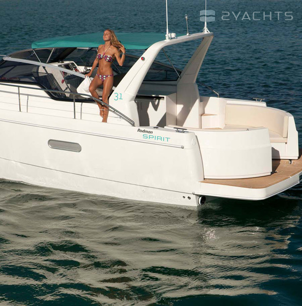 Rodman Spirit 31 Open is an open-type cruise boat, produced since 2011, and in 2013 it was restyled. Created in collaboration with Italian designer Fulvio de Simoni, based on the previous Hardtop model. Length 9.48 meters, width - 3.36 meters, accommodates 8 people and is intended for going out to sea no further than 200 miles from the coast. Suitable for walking, fishing or water sports in fine summer weather, the bimini awning guarantees passengers protection from the sun.