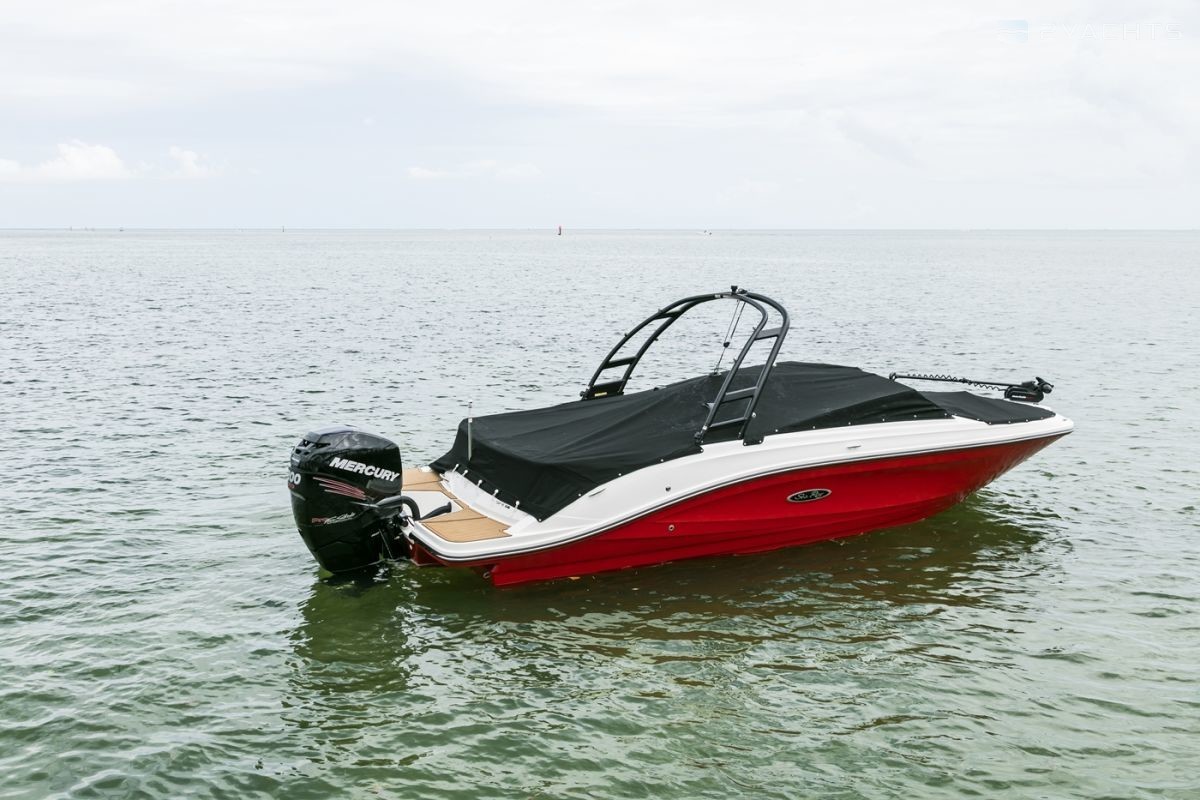 The hull of the boat Sea Ray SPX 230 OB is made of fiberglass. It has a length of 7.01 meters and a draft of 0.82 meters. The ship is equipped with an outboard engine and comes with a 150 hp FourStroke Mercury engine.