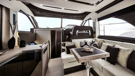 Salon Sessa Fly 42 with sofas and a table forming the dining area is located on the main deck, there is also a main control room and a galley with a stove, microwave and sink. Through sliding glass doors from the passenger compartment, exit to the transom with a sofa set here and a folding table. Aft swimming platform.