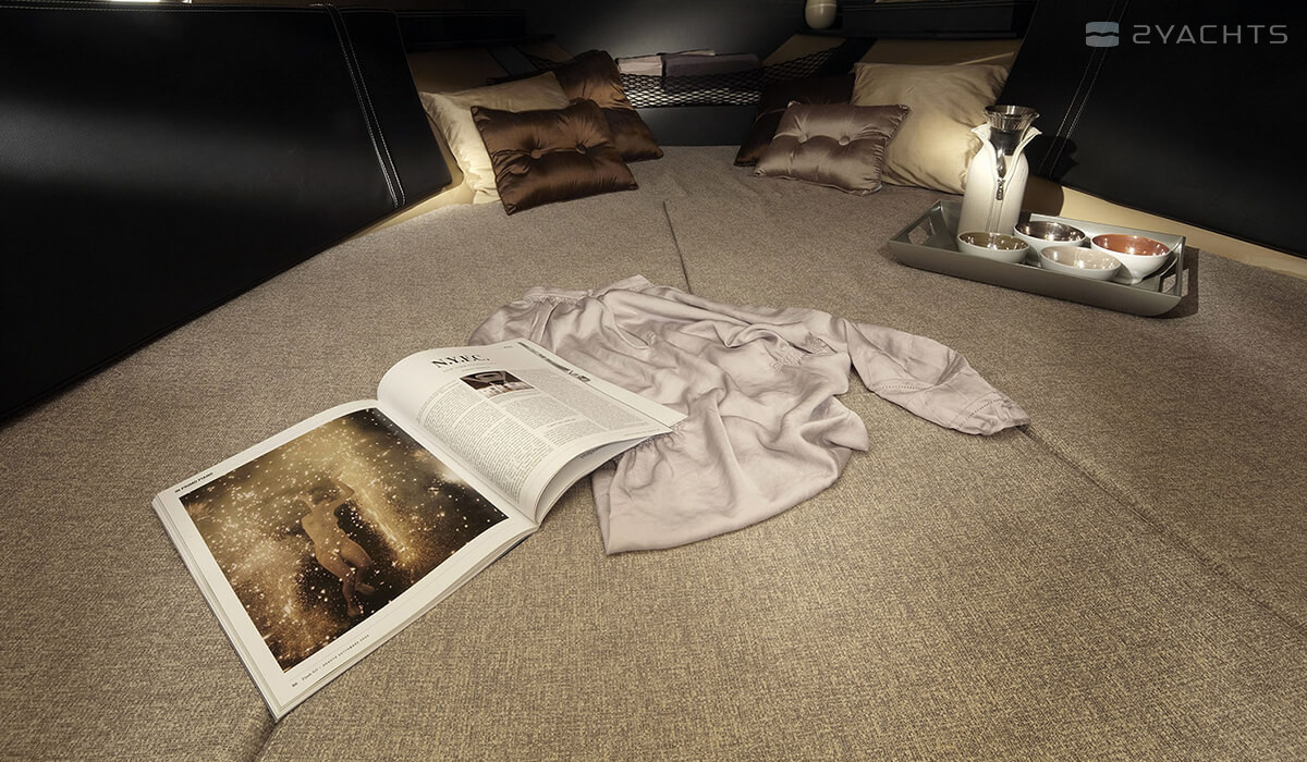 In the bow of the deck there are loungers for relaxation with upholstery resistant to UV rays and water. On the cockpit there is a caddy cabin with front glazing, two swivel chairs, a corner sofa, and a sliding, adjustable table. A biminitop can be installed above the cab to protect it from the sun. Behind the sofa on the transom is a locker for accessories with a soft lid-lounger. On the port side, access to a wooden decking platform with stairs and shower.