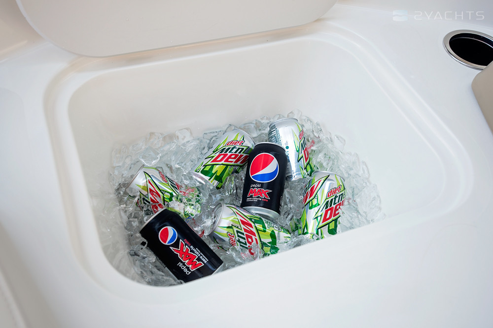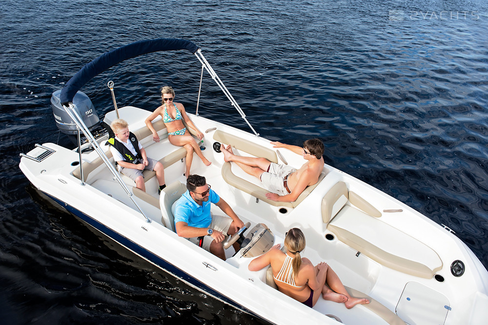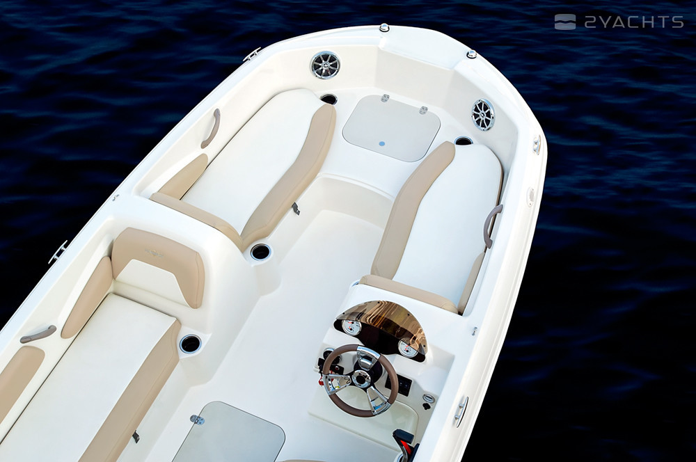 In the bow of the 182SC (OV) there is an angular sofa. With the optional filling cushion, the seating area can be extended to cover the entire front deck. The basic equipment includes a cooler for drinks, stainless steel cup holders. The access to the central part of the deck, as in all models from the Deck Boats line with the center console, is through the sides of the deck.
