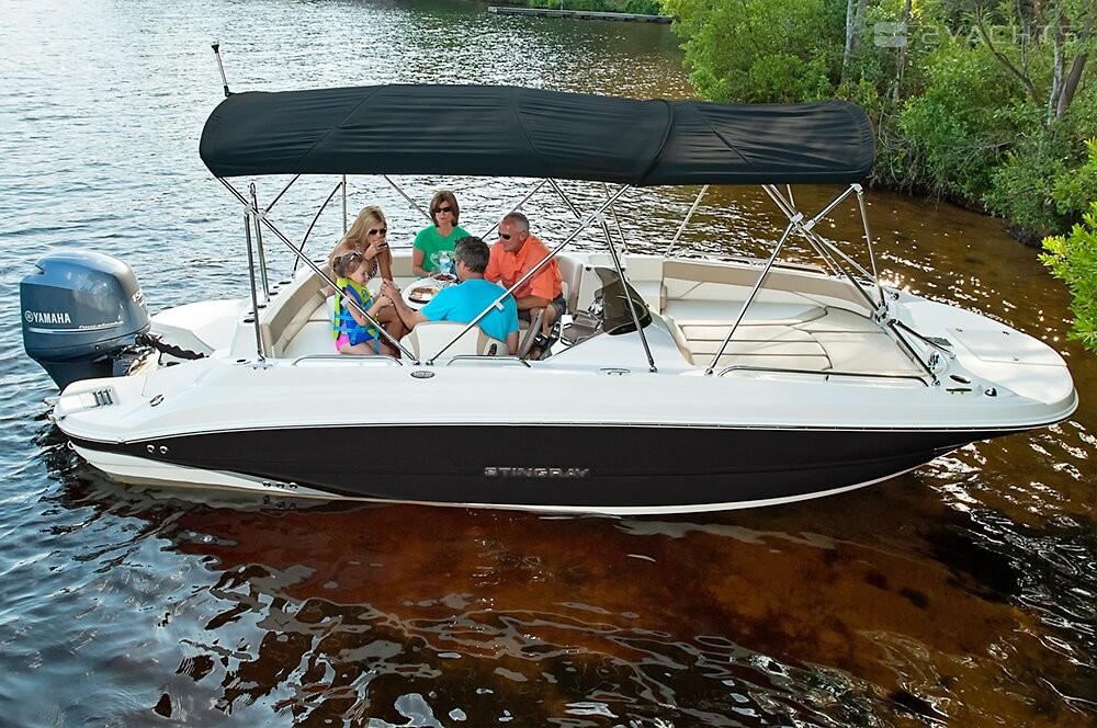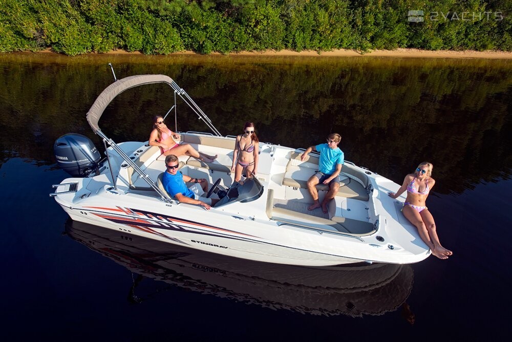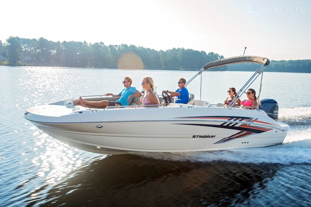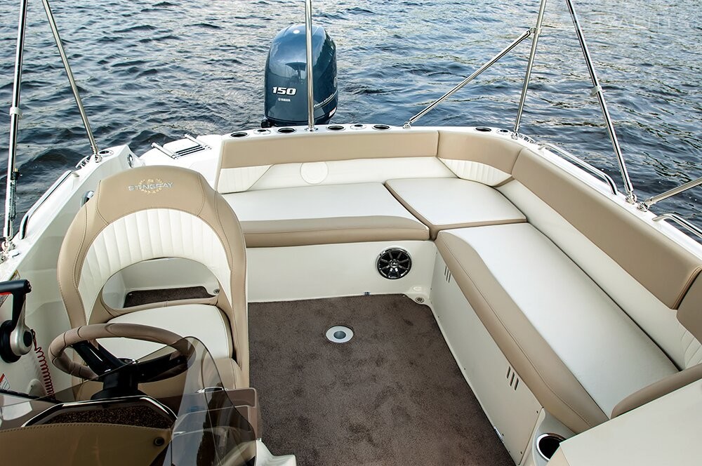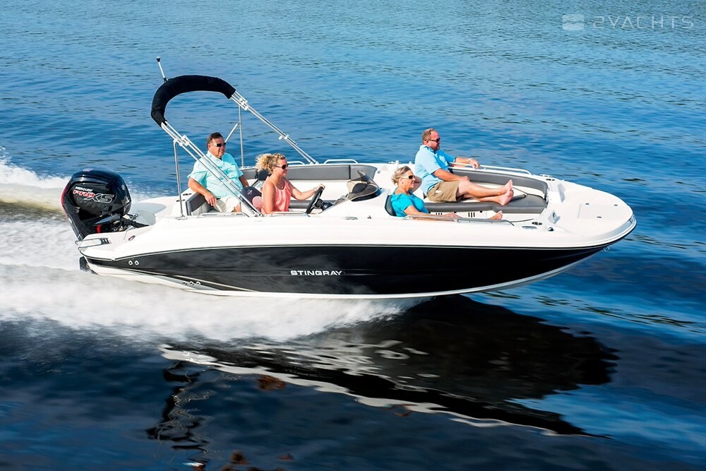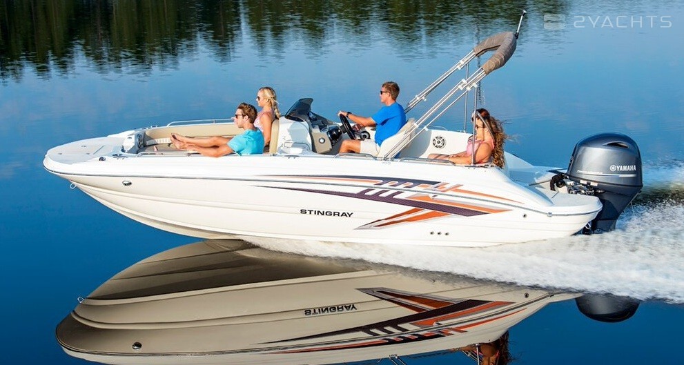 The Stingray 192SC (OV) walking bowrider is part of the Deck Boats line and was first presented in 2014, the GRP planing hull has a mainstream design. At the request of the customer, it is possible to supplement the exterior with graphics of various colors: red, blue, green or orange, as well as decorate with a stripe in a contrasting shade.