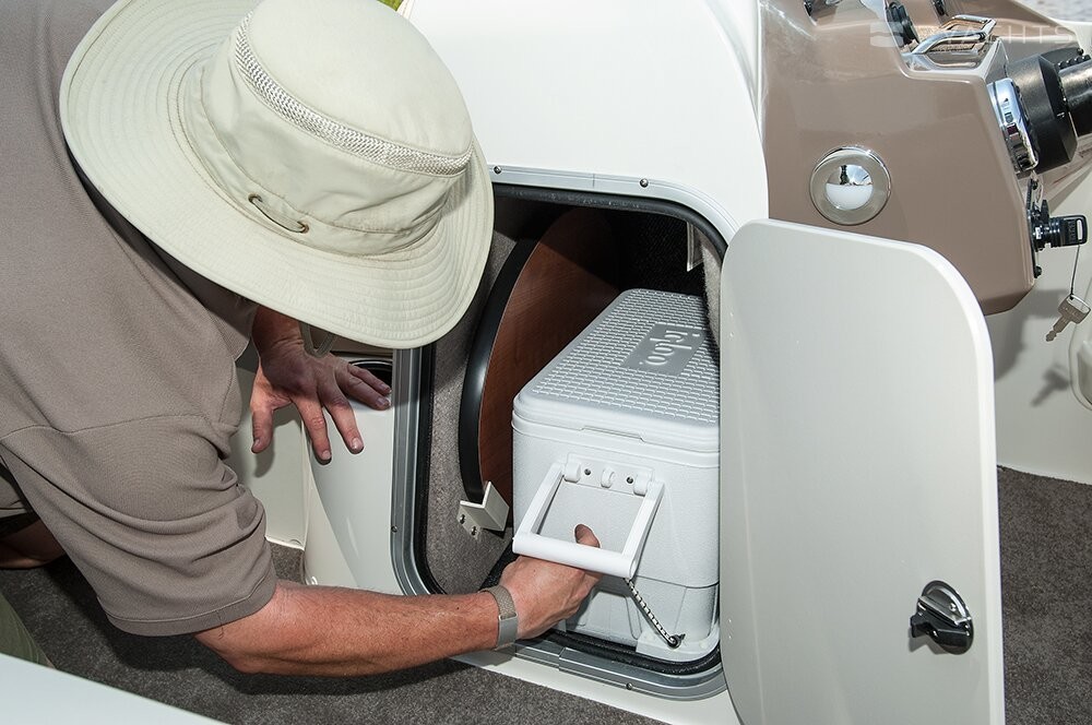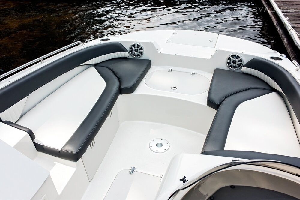 The bow section with the corner sofa transforms into a seating area for the entire forward deck using a filling cushion. For the convenience of passengers, a drinks cooler, cup holders and a stainless steel folding handrail are provided.