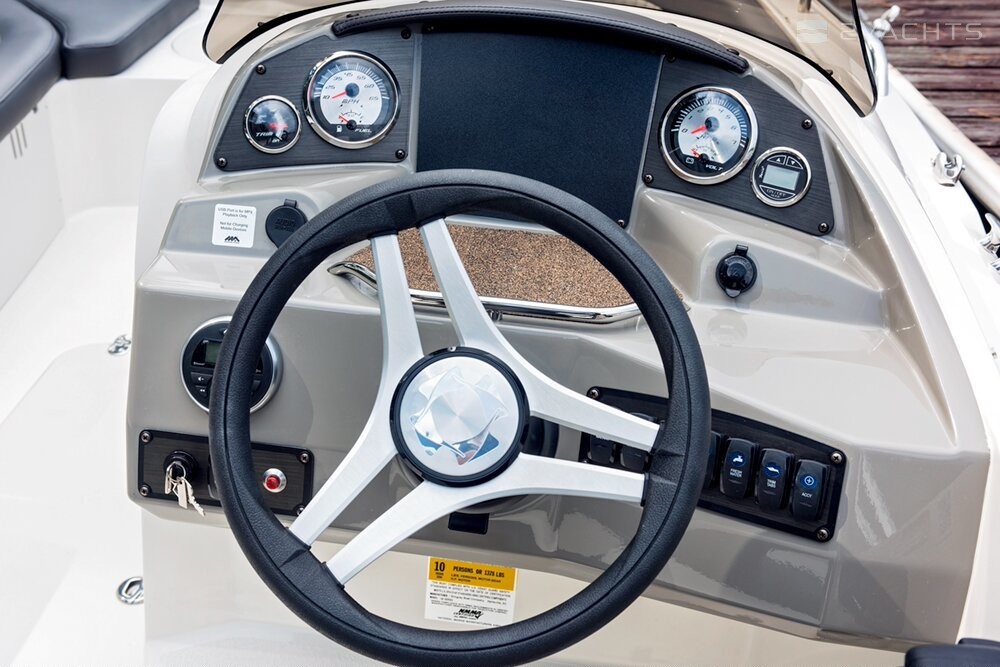 The transition to the cockpit is carried out directly along the deck. For the helmsman, there is a sporty bowl-shaped seat, and a small, tinted windshield over the illuminated dashboard and steering wheel. There is a spacious storage compartment under the removable carpet in the central part of the deck. In the aft part there is a corner sofa and 4 stainless steel cup holders, a place for attaching a removable engine.