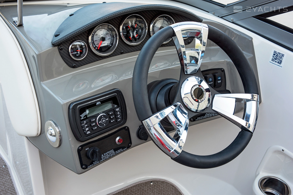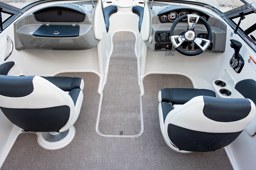 The spacious 198LX cockpit, with fiberglass trim and anti-slip platform, has 2 bowl-shaped chairs with a floor hatch between them. The basic configuration includes a Dino adjustable steering wheel with a lock, illumination of the dashboard and switches, a sink with fresh water, a gas stove, a dry closet with a storage tank. The standard equipment of the boat includes an echo sounder, a 12 V cigarette lighter, power steering, and an electronic hour meter.