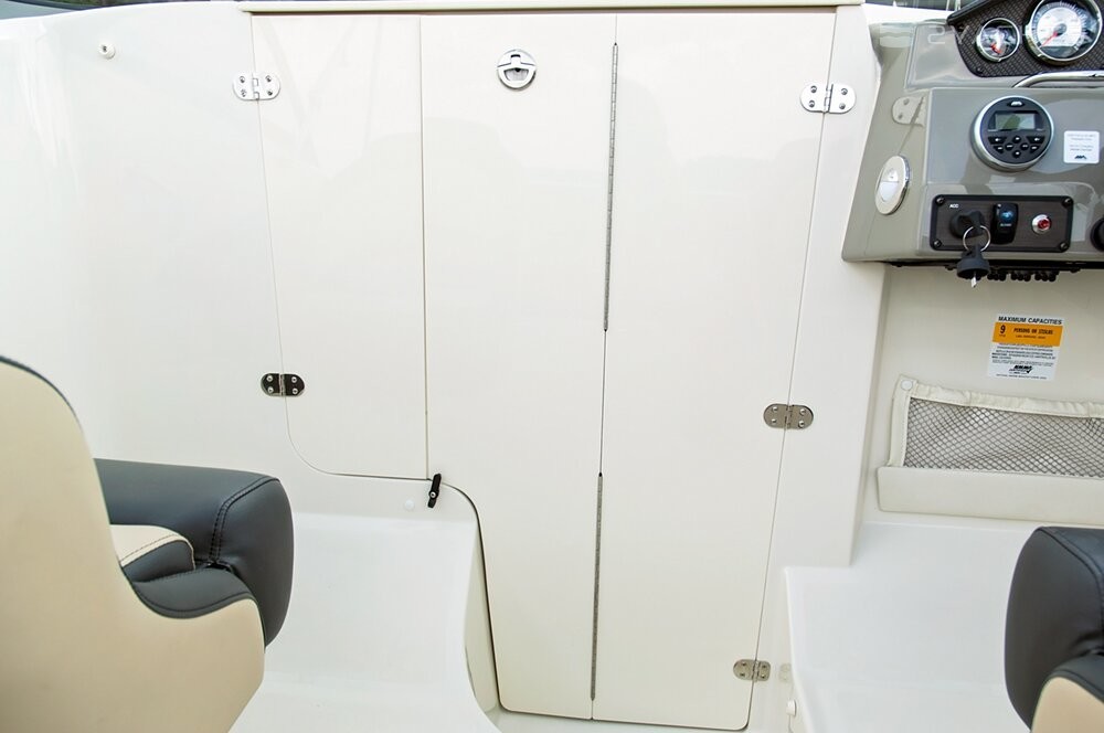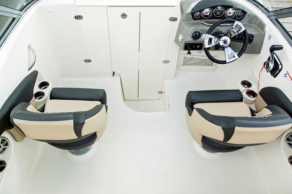 A feature of the 208 CR open boat is the anchor compartment and hatch located in the bow. The ship can accommodate up to 9 passengers. On the cockpit with fiberglass finish, there is a built-in cooler for drinks, an optional removable table, a detachable carpet, stainless steel cup holders, and a lockable cabin door. For the convenience of crew members, the boat is equipped with integrated illumination of the switches and the dashboard, an adjustable steering wheel with the possibility of locking.