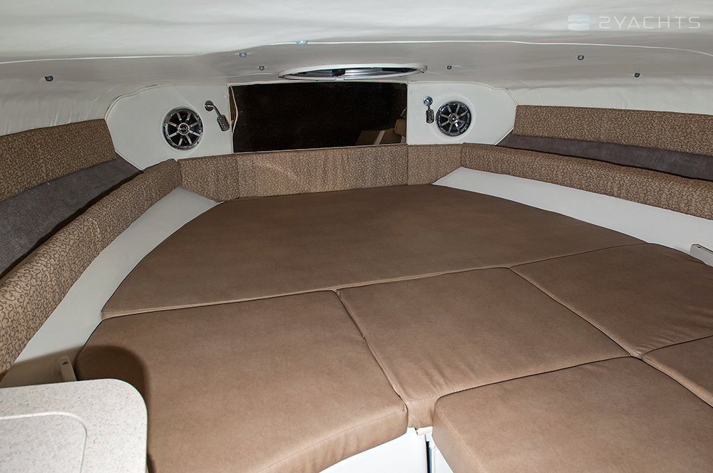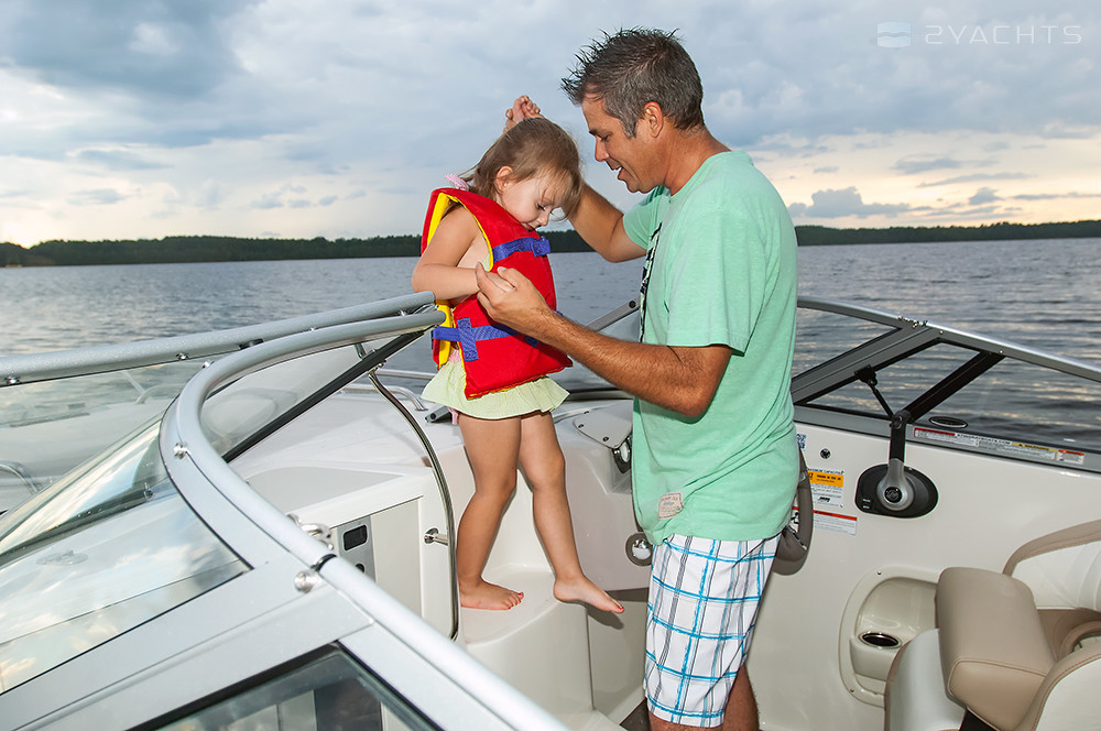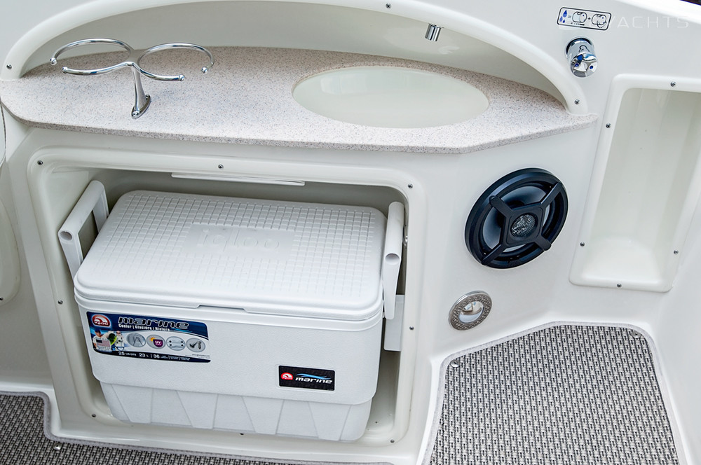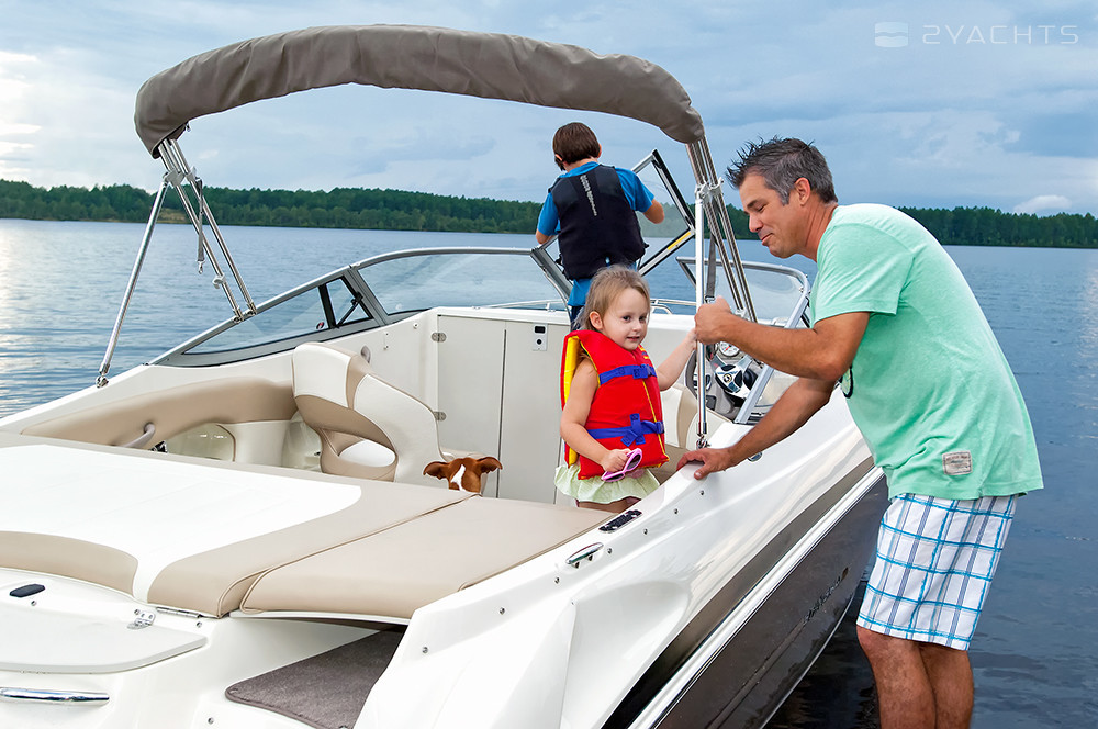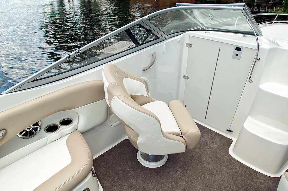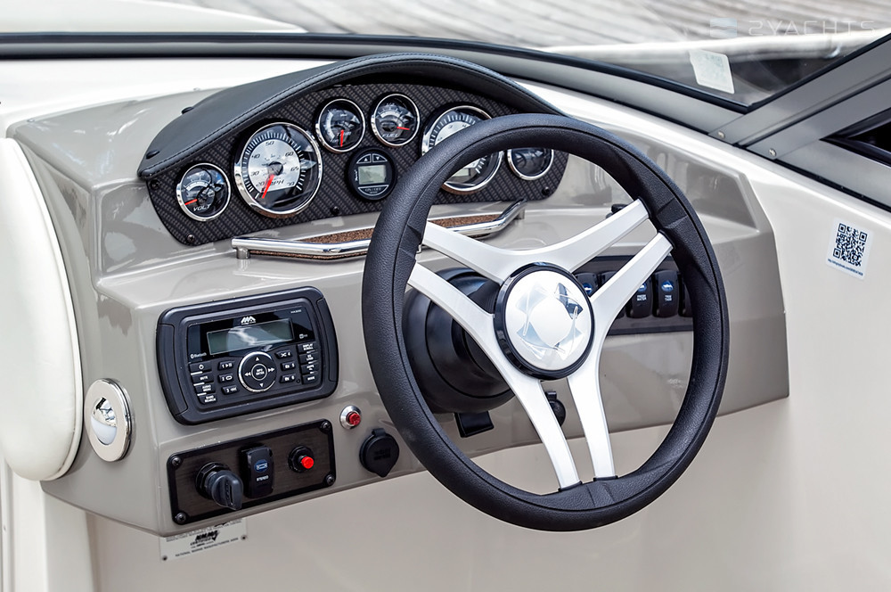 235CR is designed for the simultaneous stay of up to 12 passengers. The vessel is equipped with a windshield opening in the middle for easy exit through it. There is a shower on the transom, a 49 liter fresh water tank. In the bow there is a locker for storing things, a bathing platform with anti-slip coating, handrails and a stainless steel staircase are provided. On the cockpit with fiberglass trim there is a backlight, a built-in cooler for drinks, an audio system.