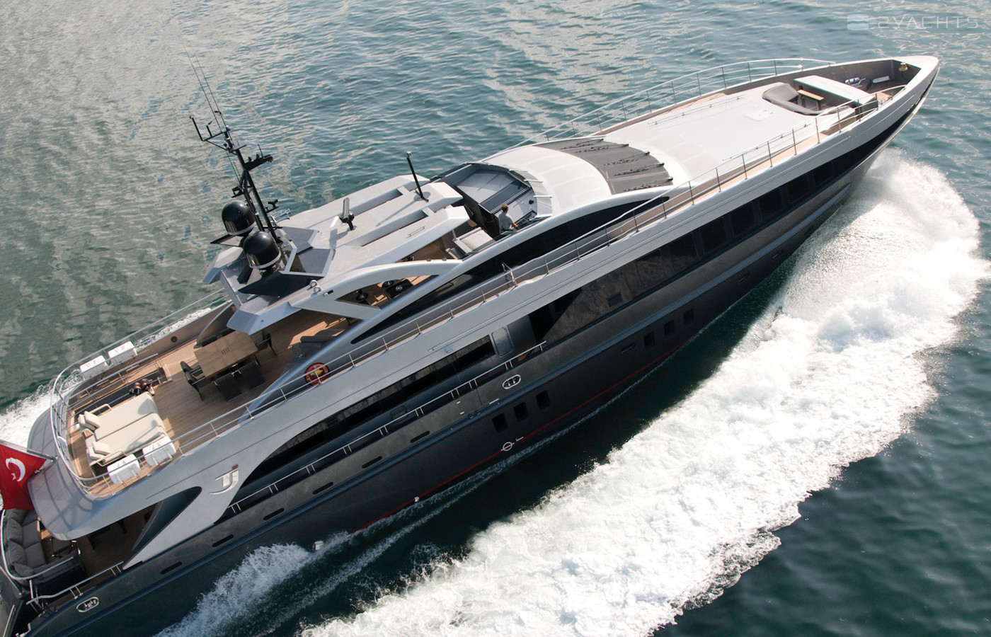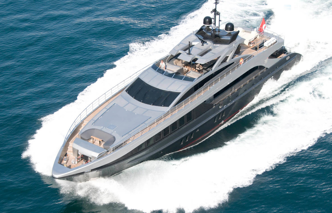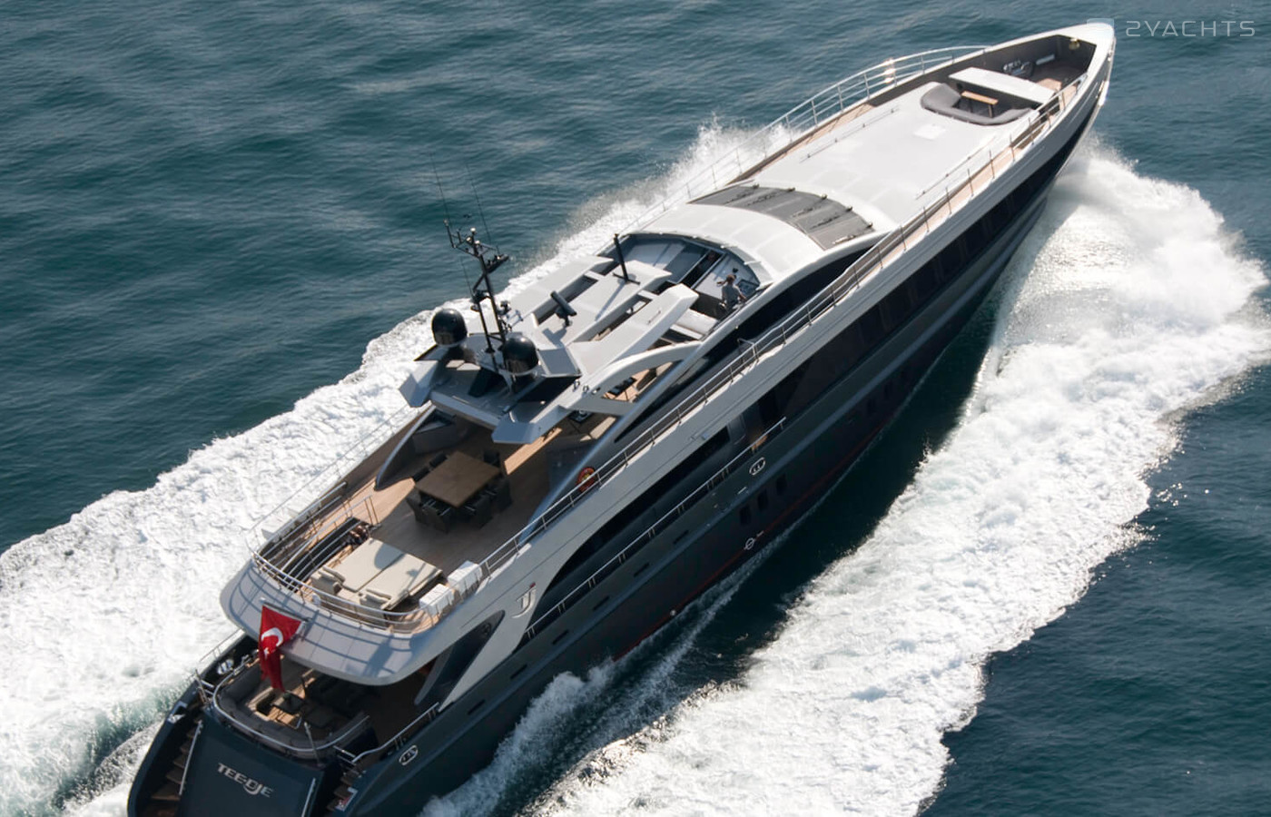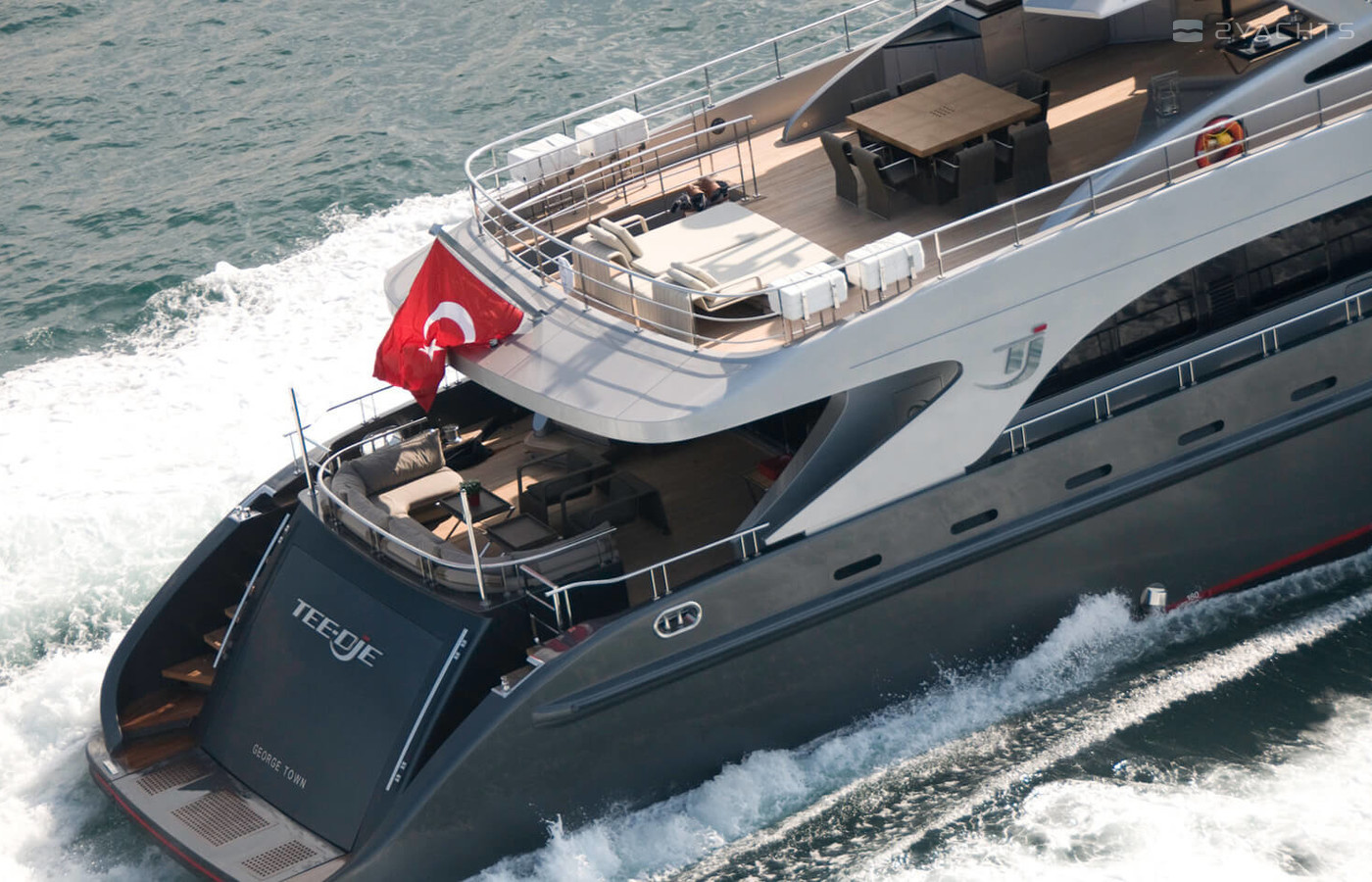 The 121.39ft /37m BILGIN 123 Fly-Bridge ‘Tee-Dje’ . The yacht’s exterior design and engineering were the work of Bilgin Yachts whereas the interior was designed by H2 Design of the U.K. Tee-Dje can host up to 8 guests in 4 cabins, including a master suite. She is also capable of accommodating up to 6 crew on board to ensure a comfortable yachting experience.
