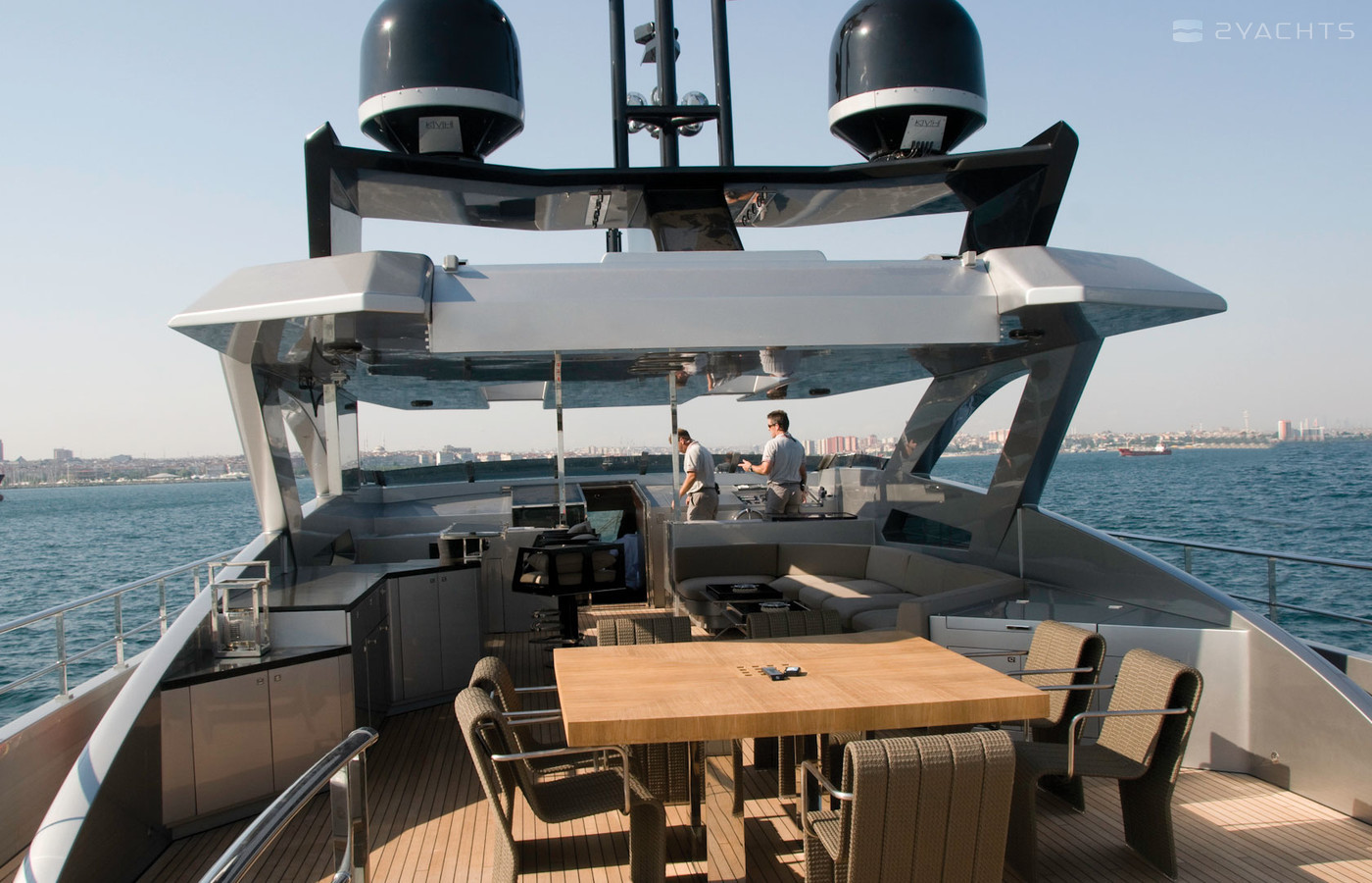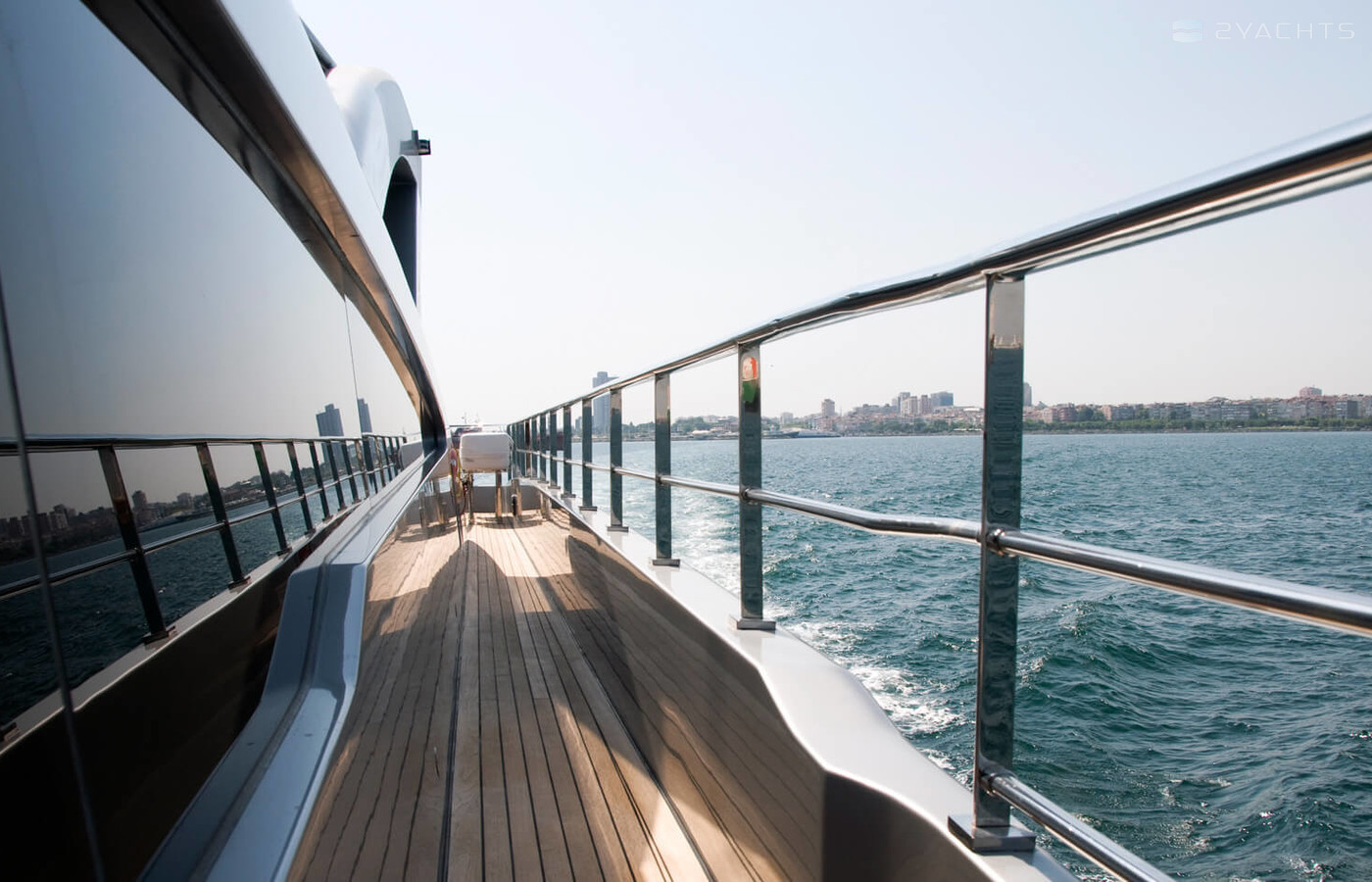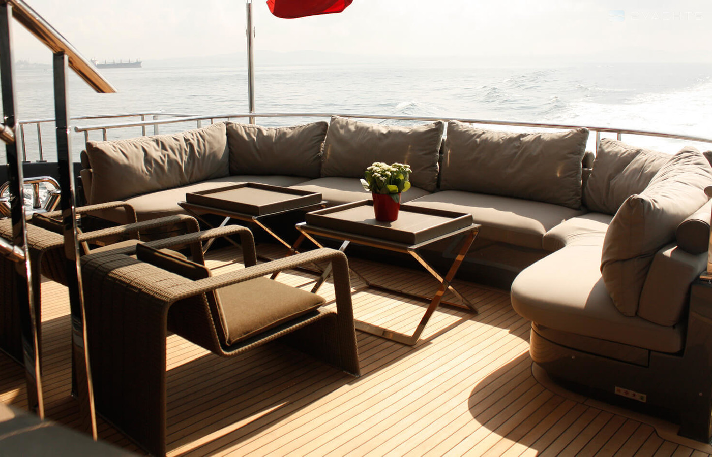 The 121.39ft /37m BILGIN 123 Fly-Bridge ‘Tee-Dje’ . The yacht’s exterior design and engineering were the work of Bilgin Yachts whereas the interior was designed by H2 Design of the U.K. Tee-Dje can host up to 8 guests in 4 cabins, including a master suite. She is also capable of accommodating up to 6 crew on board to ensure a comfortable yachting experience.