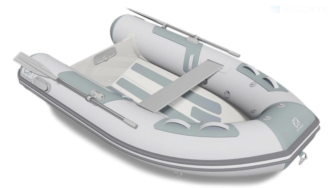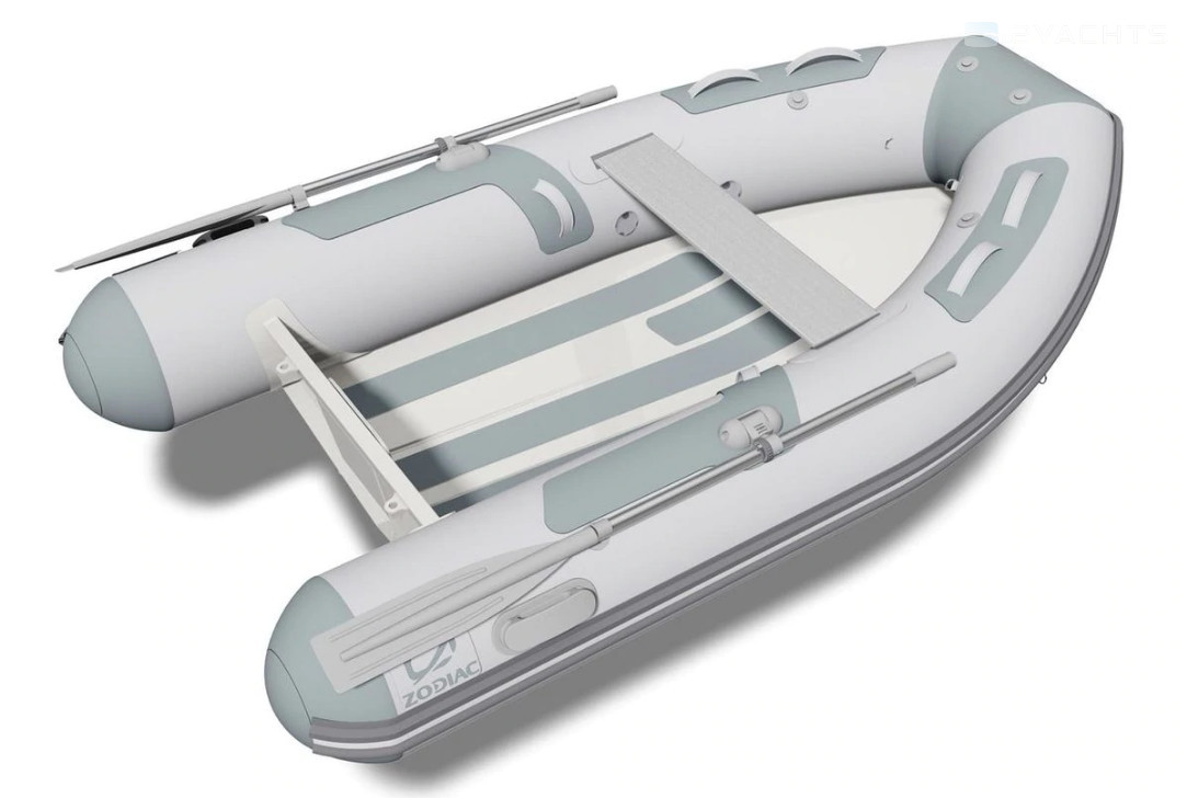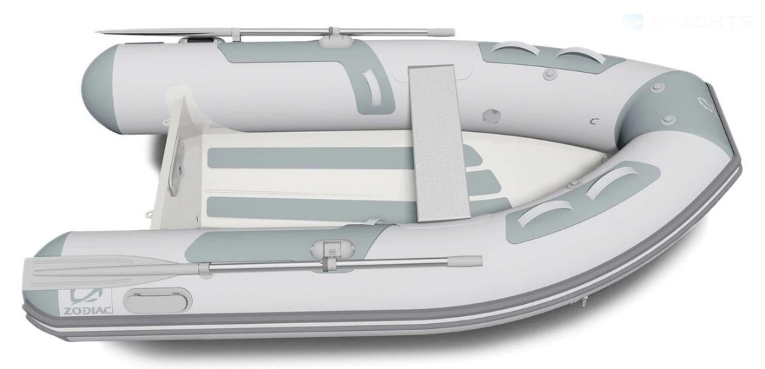 A removable bench for several people, made of plastic, is installed on the boat's cockpit. On the sides, on the bow and near the bench, there are fastenings for the safety of passengers, and near them - handles for transportation. The boat floor is equipped with anti-slip notches and several valves to drain the water. At the stern of the Zodiac Cadet RIB Alu 360 there is a space for personal items and a couple of towing attachments. The vessel and its components are gray-white.