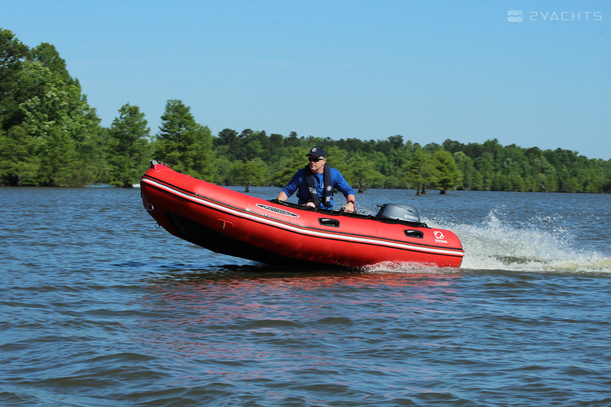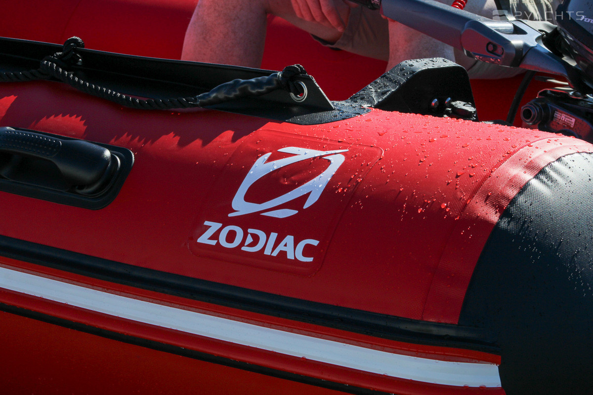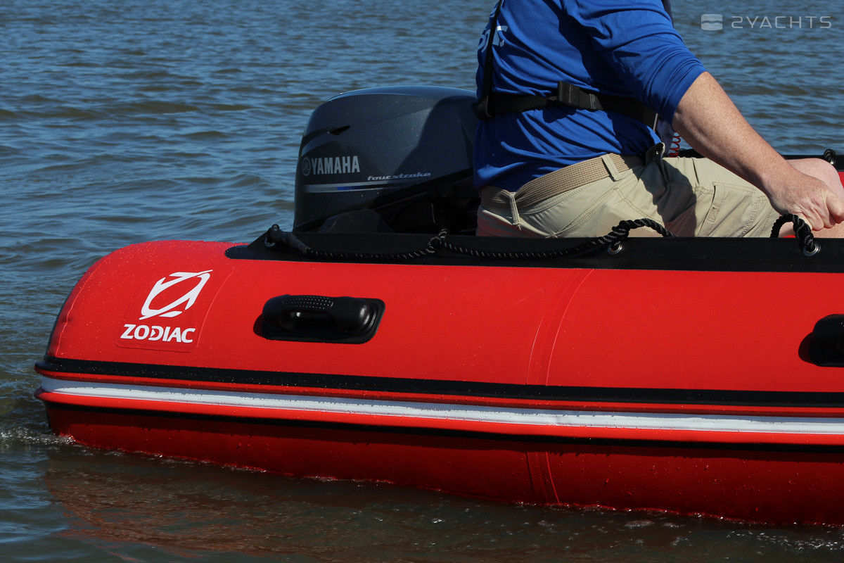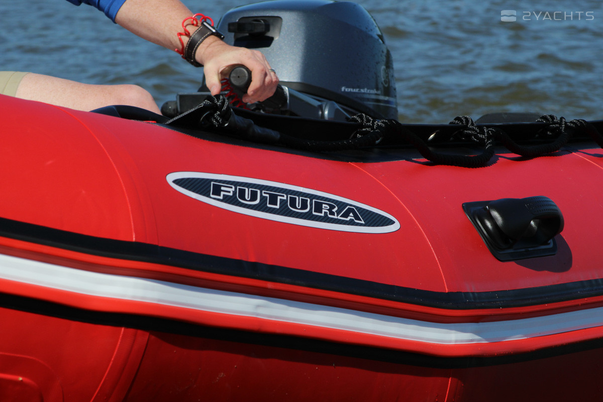 On the open bow of the vessel there is a compact sofa in which a spacious locker is mounted. On both sides there are fastenings for the safety of passengers and handles for transportation, and on the left there is a passage to the bow. The Zodiac Futura Mark II C cockpit is equipped with a control panel with a compact box for personal belongings, opposite which there is a soft chair. On the floor of the vessel there are anti-slip notches and valves for draining the water, and on the stern - two mounts for towing. The vessel and its components are red and black.