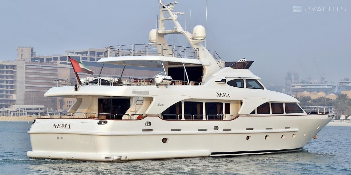 Нема-это 30.24 м / 99'3" роскошных моторных яхт. Она была построена на верфи Benetti в 2007 году. С Лучом 7.15 м и проект 1.79 м, она имеет корпус и надстройка стеклопластик стеклопластик. Это добавляет к общим водоизмещением 193 тысячи тонн. Она питается от двигателей, придавая ей максимальную скорость в 15 узлов и крейсерскую скорость в 12 узлов. Максимальная дальность нема, составляет 2100 морских миль. На моторной яхте могут разместиться 8 гостей в 4 каюты с дизайном интерьера исполнителя Francois zuretti С и внешний дизайн Стефано нее.