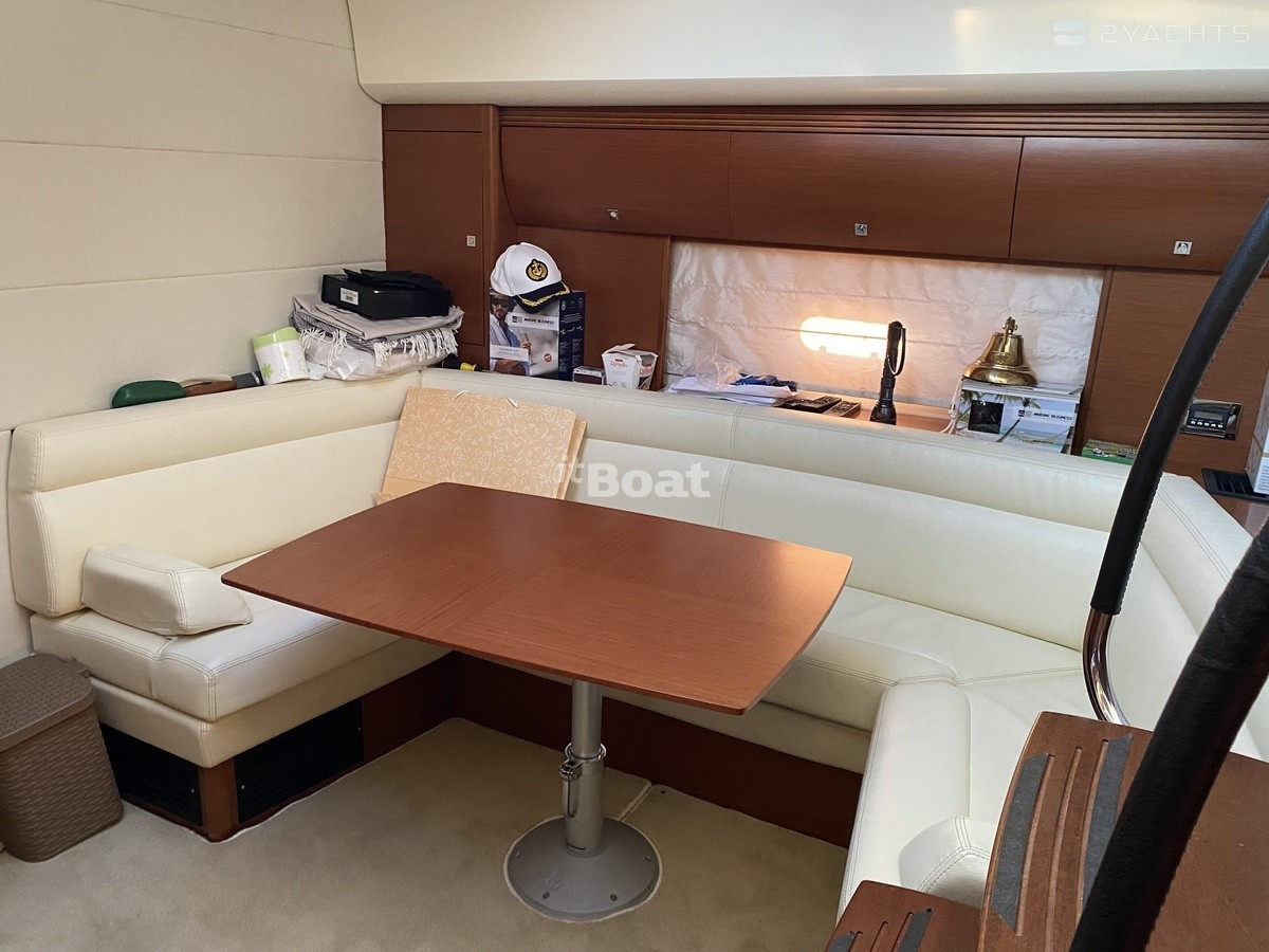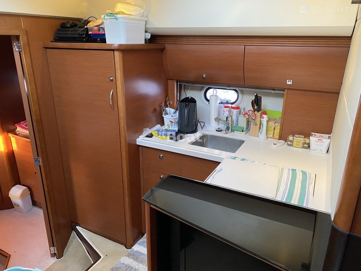 Следуя современным трендам, французские инженеры разместили мастер каюту на миделе яхты, далеко не все лодки 40-45 футов могут этим похвастать. Аппартаменты владельца получились весьма просторными и светлыми, благодаря огромному иллюминатору. Хозяйская зона также оснащена приватным санузлом и будуарным столиком. Далее двигаясь к носу - уютный салон с полностью укомплектованным камбузом, U-образный диван со столом напротив (трансформируется в дополнительные спальные места). Носовая каюта с двуспальной кроватью, большим гардеробом и отдельным входом в общий санузел.