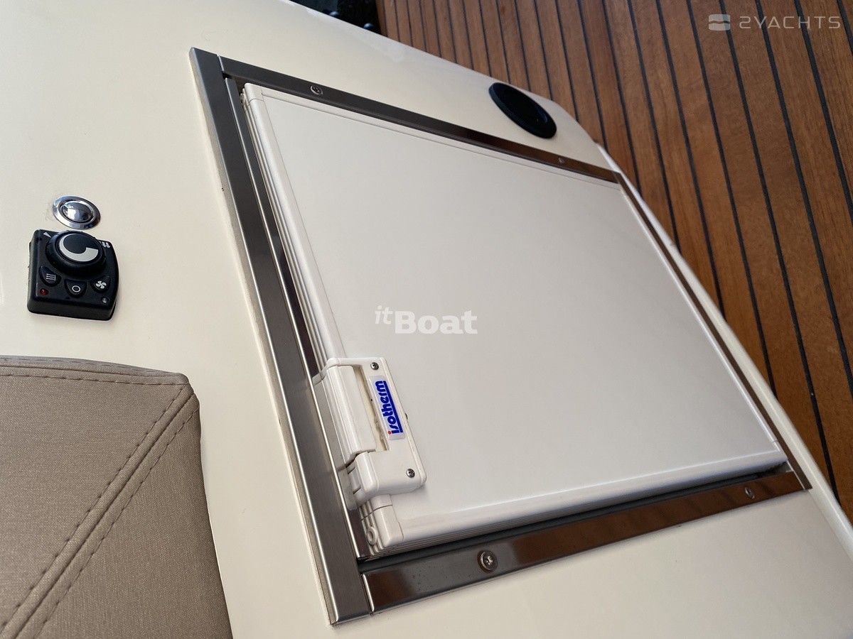 Плавные линии силуэта, и универсальная планировка, подходящая для любой климатической зоны от Средиземноморья до Балтики. В жаркую погоду Вы открываете огромный сдвижной люк в хард-топе и пускаете внутрь солнце и свежий ветер. Пошел дождь, хард-топ закрывается и благодаря полупрозрачной перегородке, отделяющей салон от кокпита, Вы получаете герметичную кабину. В этой уютной зоне помимо небольшой обеденной группы напротив поста управления также расположен вет-бар с холодильником и электрическим грилем.