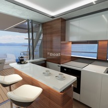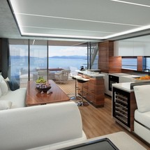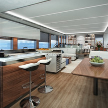- динетта (полноценно укомплектованная кухонным оборудованием), совмещенная со столовой, плавно переходящей в открытую зону кокпита.