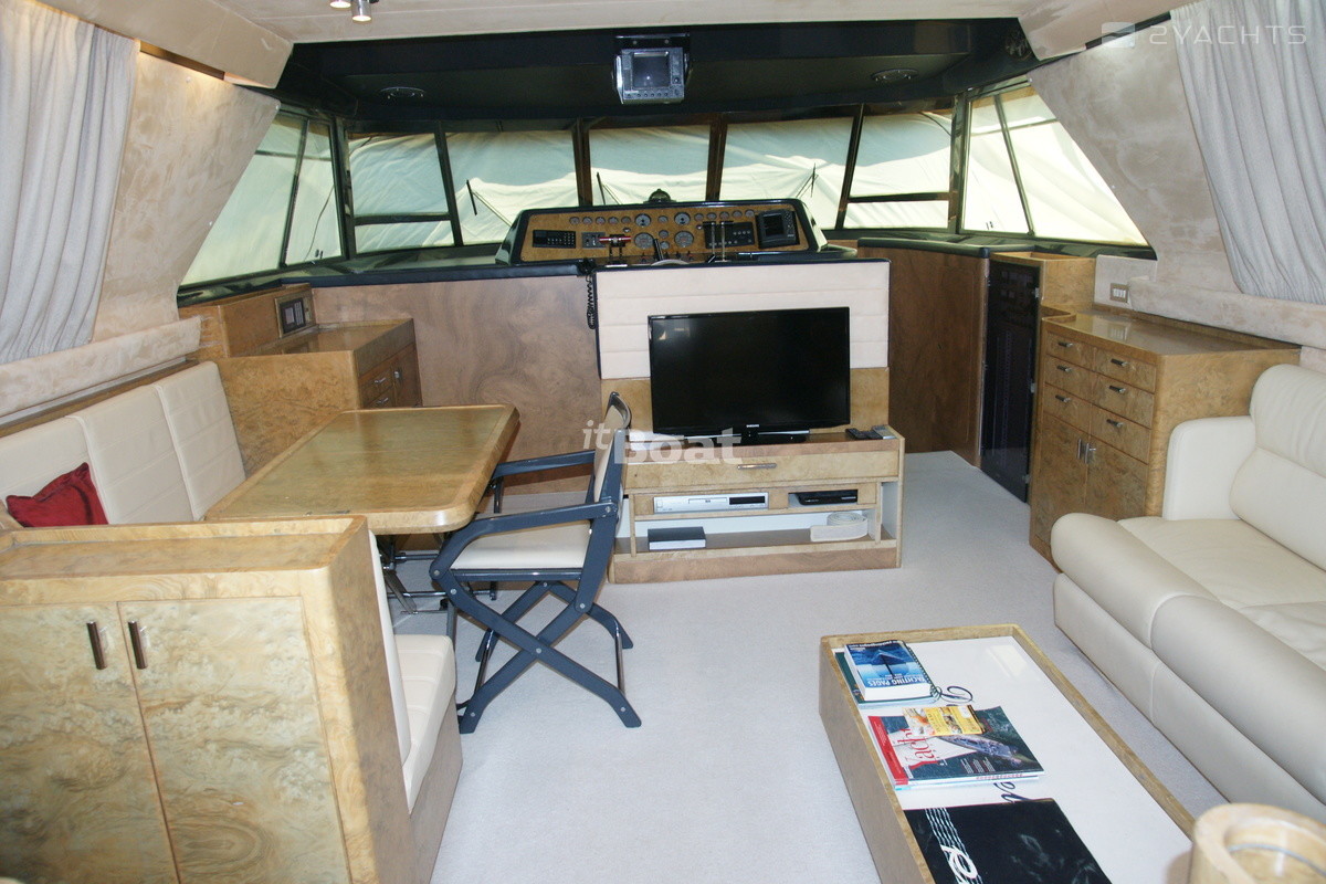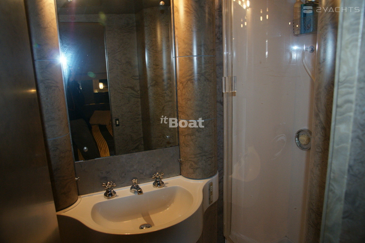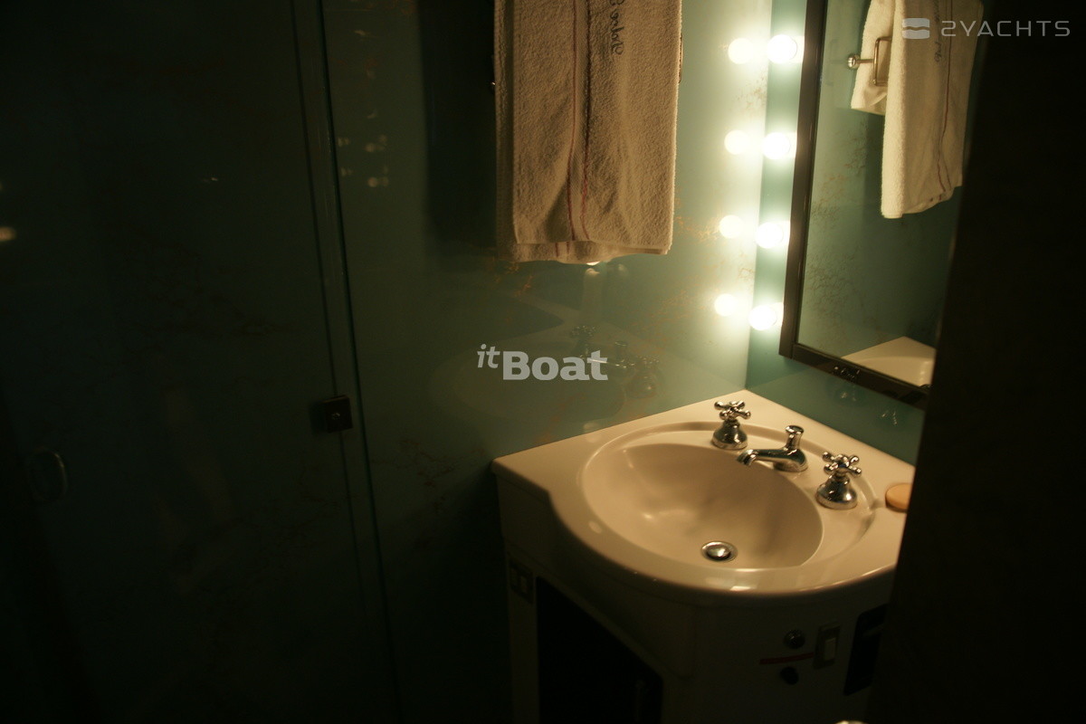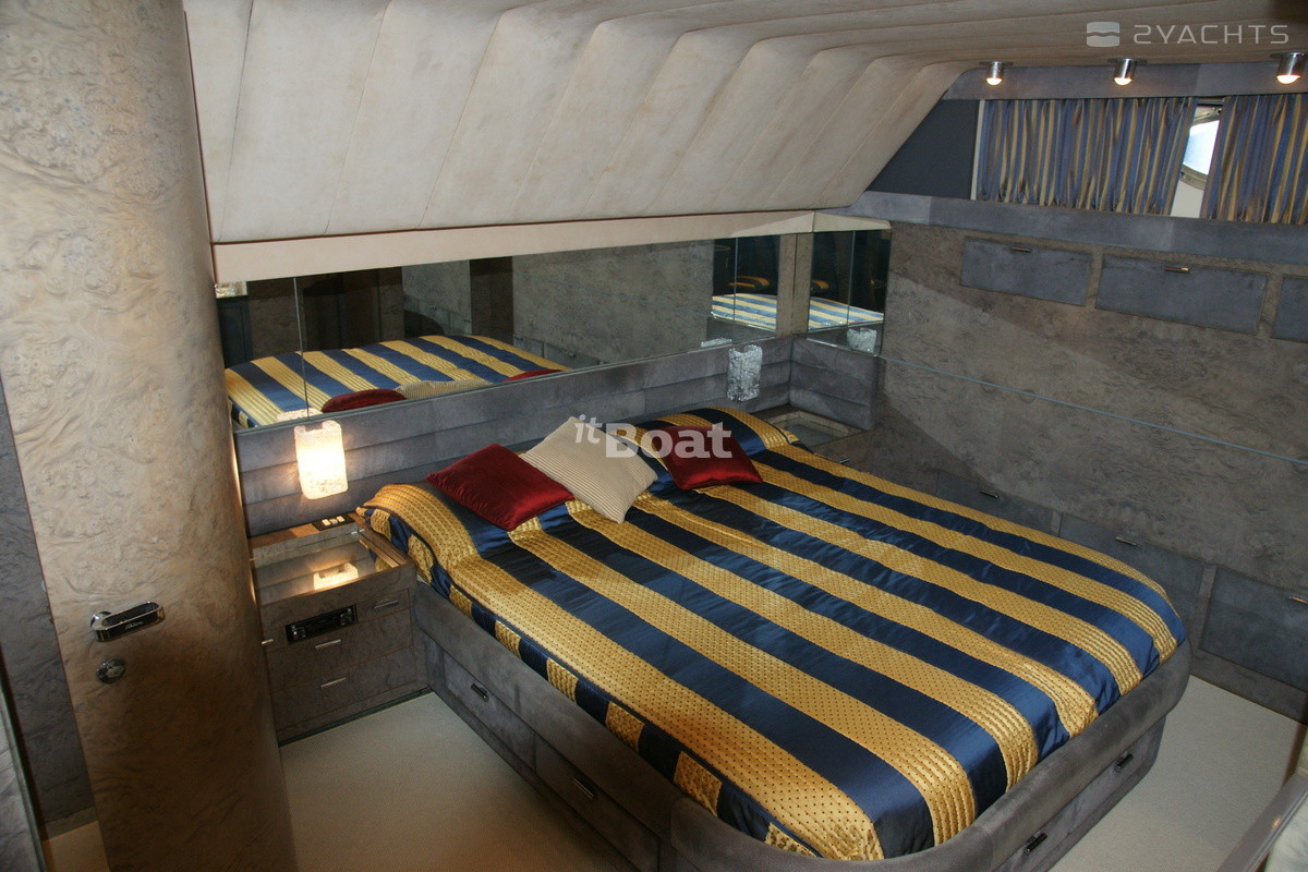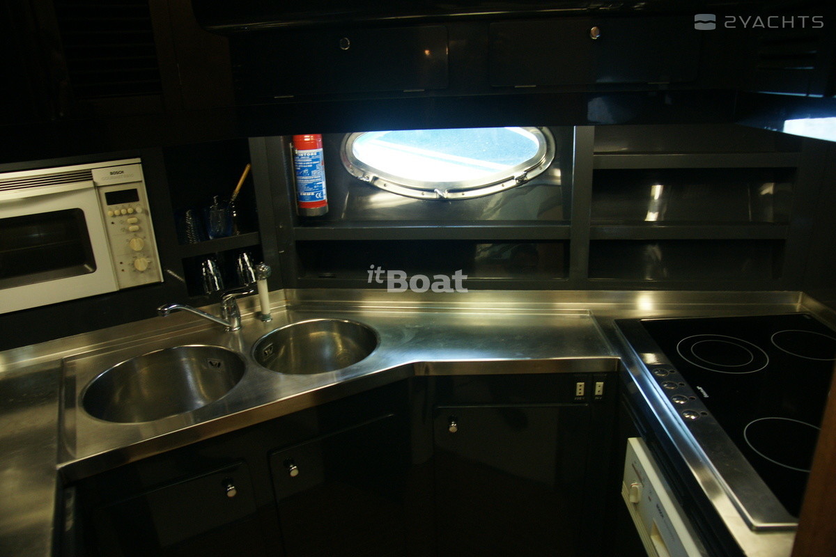 Лодка в очень хорошем состоянии, третий владелец, прямой контакт. В 2011 году яхта прошла общий осмотр с обновлением RINA. Гостиная - салон; Кухня на первом этаже с новой керамической плитой, духовкой и посудомоечной машиной, холодильник (всего 5 на яхте); 3 каюты с душевыми/туалетами, плюс кабина экипажа на носу лодки с собственным туалетом: - Каюта судовладельца на корме с ванной, - VIP-каюта с ванной, - Гостевая каюта с двухъярусными кроватями"L" с ванной, - Носовая каюта экипажа для 2-х человек с ванной комнатой Носовое подруливающее устройство - гидравлический трап с емкостью kg.360 для варусного / вытаскивания тендера - тендер в комплекте с автомобильным Flyer f.b. Honda 20 л.с. - Опреснитель Спутниковая антенна с 3мя телевизорами (плазма) - Стиральная машина - воздушный компрессор - полный набор чехлов и подушек для зоны отдыха на флай-бридже (Sundeck) Описание приборов: VHF - GPS / плоттера последнего поколения - Радар Furuno 75 мг - Автопилот - эхолот