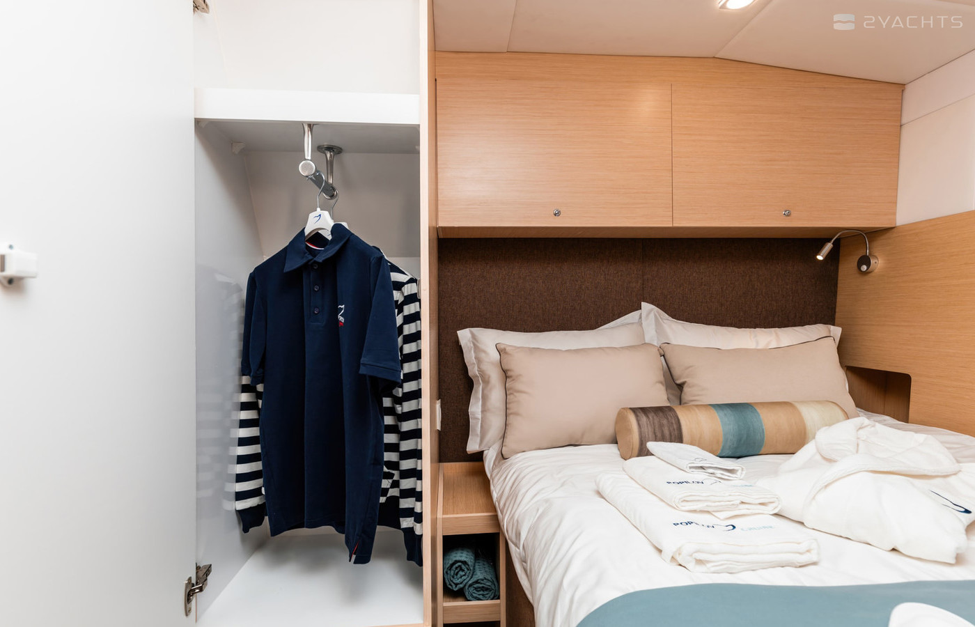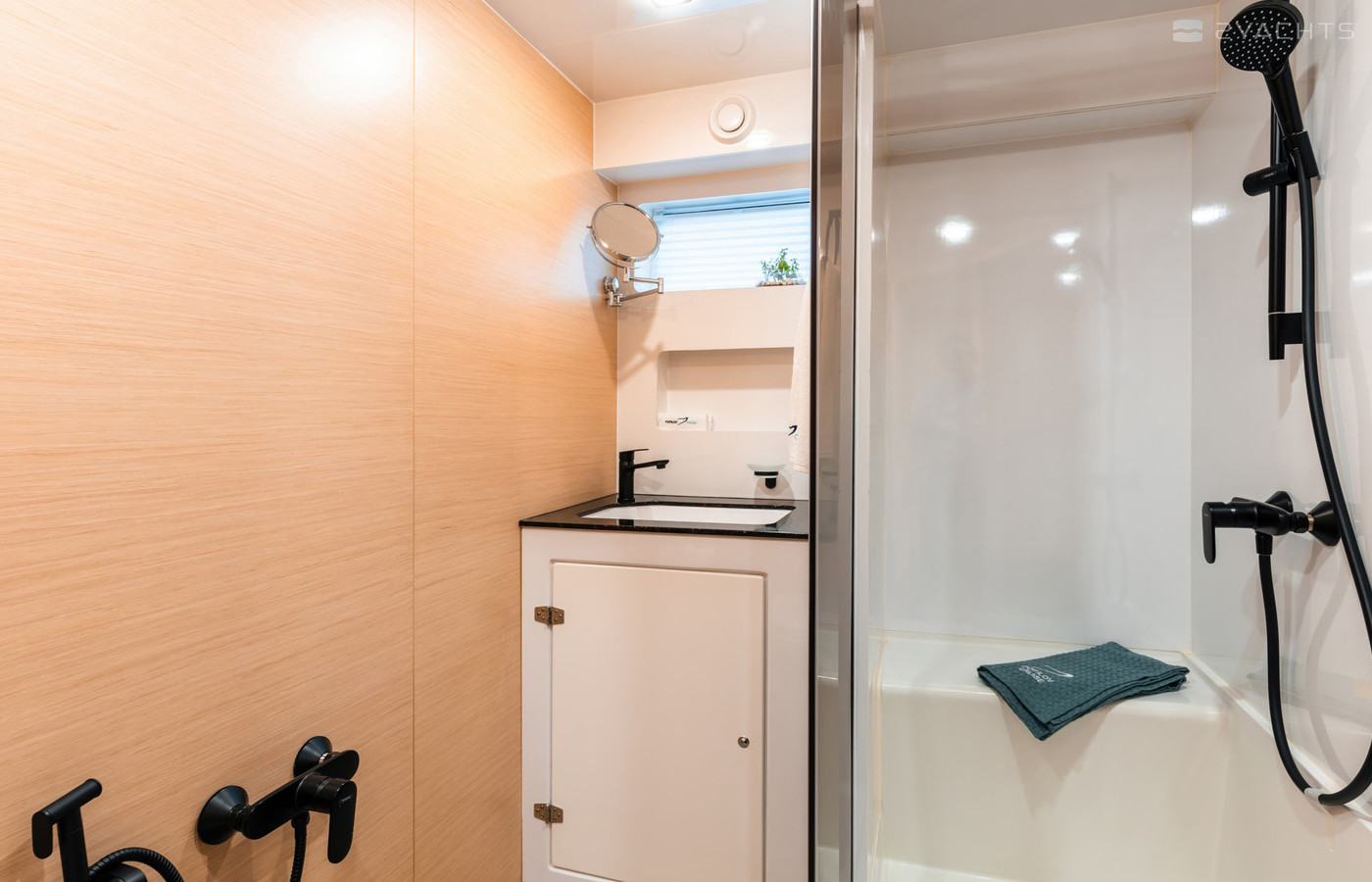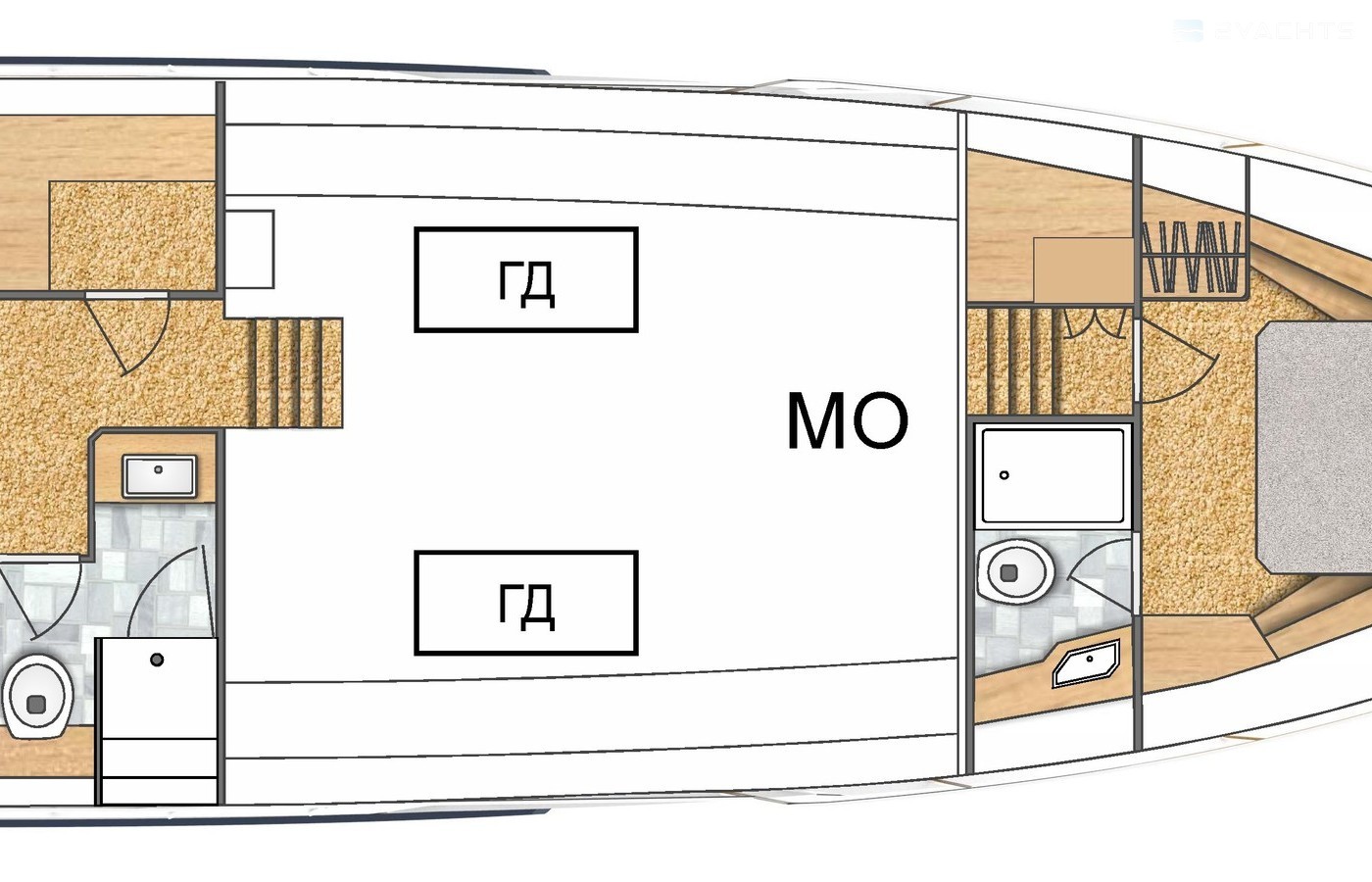 - верхняя палуба: кокпит с угловым диваном и раскладным столом, просторная носовая палуба, сандек на крыше рубки.