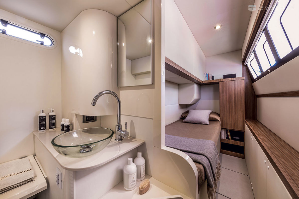 На камбузе судна предусмотрена столешница Corian, широкие подвесные шкафы, а также угловой диван с матовой отделкой. При производстве палубы используется скальный дуб с пепельным оттенком. В нижней части палубы расположено 3 каюты с шестью спальными местами, каждая из которых оснащена двуспальными кроватями, ящиками, шкафами из натурального дерева, прикроватными тумбами в темно-коричневом исполнении, а также предусмотрено 2 санузла для гостей с душем, настенным шкафом с зеркалом, полками, электрическим туалетом со смывом и угловым шкаф из досок ореха Каналетто.
