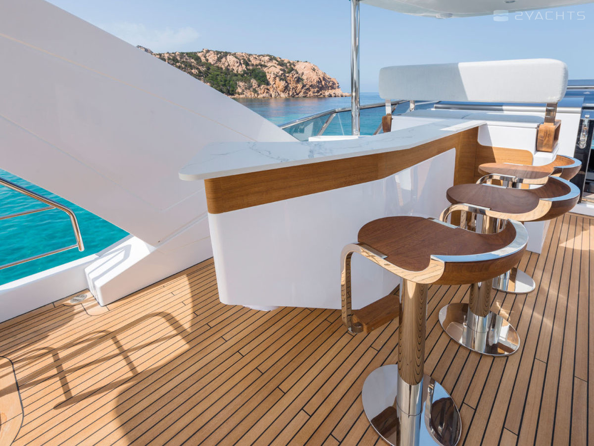 Эта 27-метровая яхта отличается большим количеством свободного пространства. На затененном флайбридже находится полноценный пост управления, большой угловой диван, обеденный стол и барная стойка. Для отдыха также предусмотрены лежаки в носовой части судна и затененная терраса с которой можно пройти на транец, открывающий безопасный доступ к воде. На главной палубе расположена обеденная зона, кают-компания, камбуз, пост управления и каюта владельца с отдельным санузлом и душем, гардеробом и небольшим диваном. На нижней палубе находятся четыре двухместные гостевые каюты, каждая с отдельным санузлом и двухместная каюта экипажа в кормовой части судна. Заказчику также доступна конфигурация с еще одной гостевой каютой и тендерным гаражом.