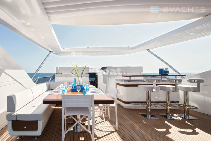 Трехпалубная яхта Azimut Grande 95, несмотря на свой внушительный вид, стараниями дизайнера Стефано Ригини (Stefano Righini) безошибочно ассоциируется со всеми моделями верфи Azimut. Характерными особенностями, подчеркивающими родство Grande 95 с младшими лодками, являются строгие квадратные окна мастер-каюты, смелое сочетание изящных формообразующих кривых с резко очерченными углами тонированных стекол и миндалевидное боковое окно рулевой рубки. Апартаменты владельца расположены в передней части главной палубы. Чтобы с огромной кровати открывался широкий панорамный вид на море, в фальшбортах сделаны характерные вырезы. На нижней палубе находятся две VIP-каюты с двуспальными кроватями, повернутыми изголовьями к борту, и две двухместные каюты. Каждая из кают оснащена отдельным санузлом. В самом носу расположены два кубрика для четырех членов экипажа, а в корме — гараж для тендера.