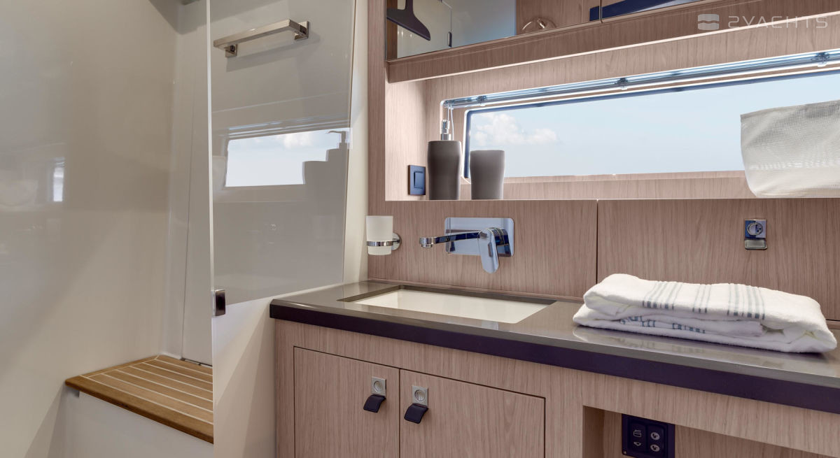 Капитанский пост расположен на кокпите – он оборудован электронными дисплеями и мягким диваном. Перед ним предусмотрены еще два дивана, оборудованных просторными рундуками, а также два компактных складных столика. По бортам расположены проходы на открытую носовую площадку, где установлены несколько мягких лежаков для загара. На корме яхты предусмотрена выдвижная платформа с раскладной лестницей для доступа к воде и креплением для буксировки.