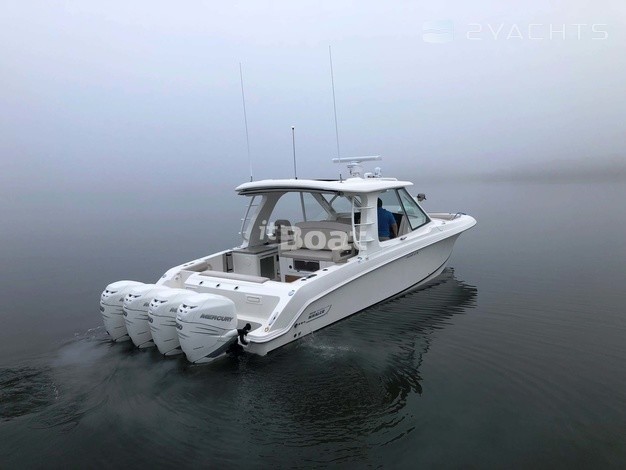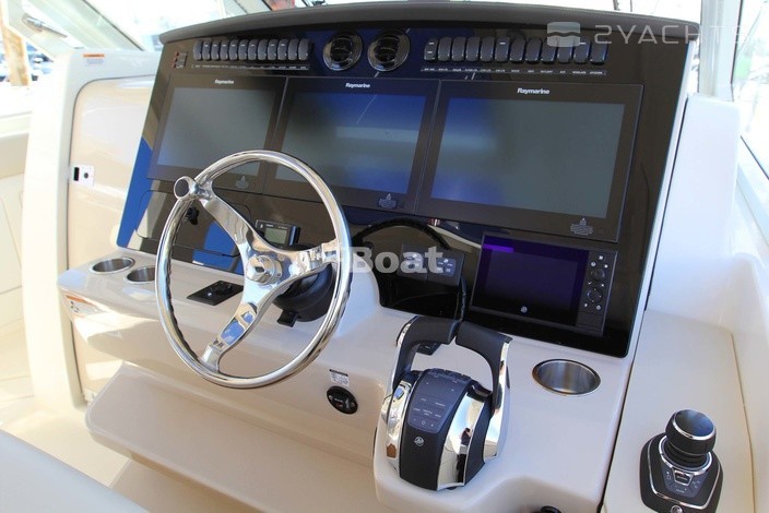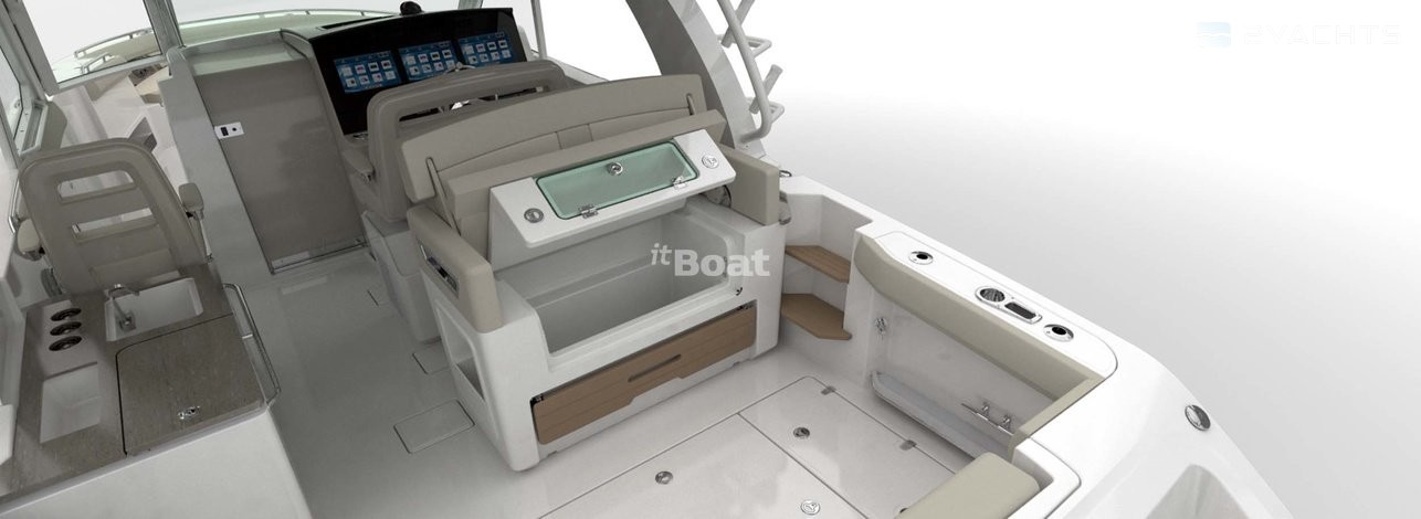 На корме установлены крепления для буксировки и удочек. Предусмотрен закрывающийся проход к платформам для доступа к воде. Boston Whaler 380 Realm комплектуется четырьмя подвесными двигателями мощностью 300 л.с. Топливный бак вмещает до 1 703 литров, бак для воды – до 227 литров.