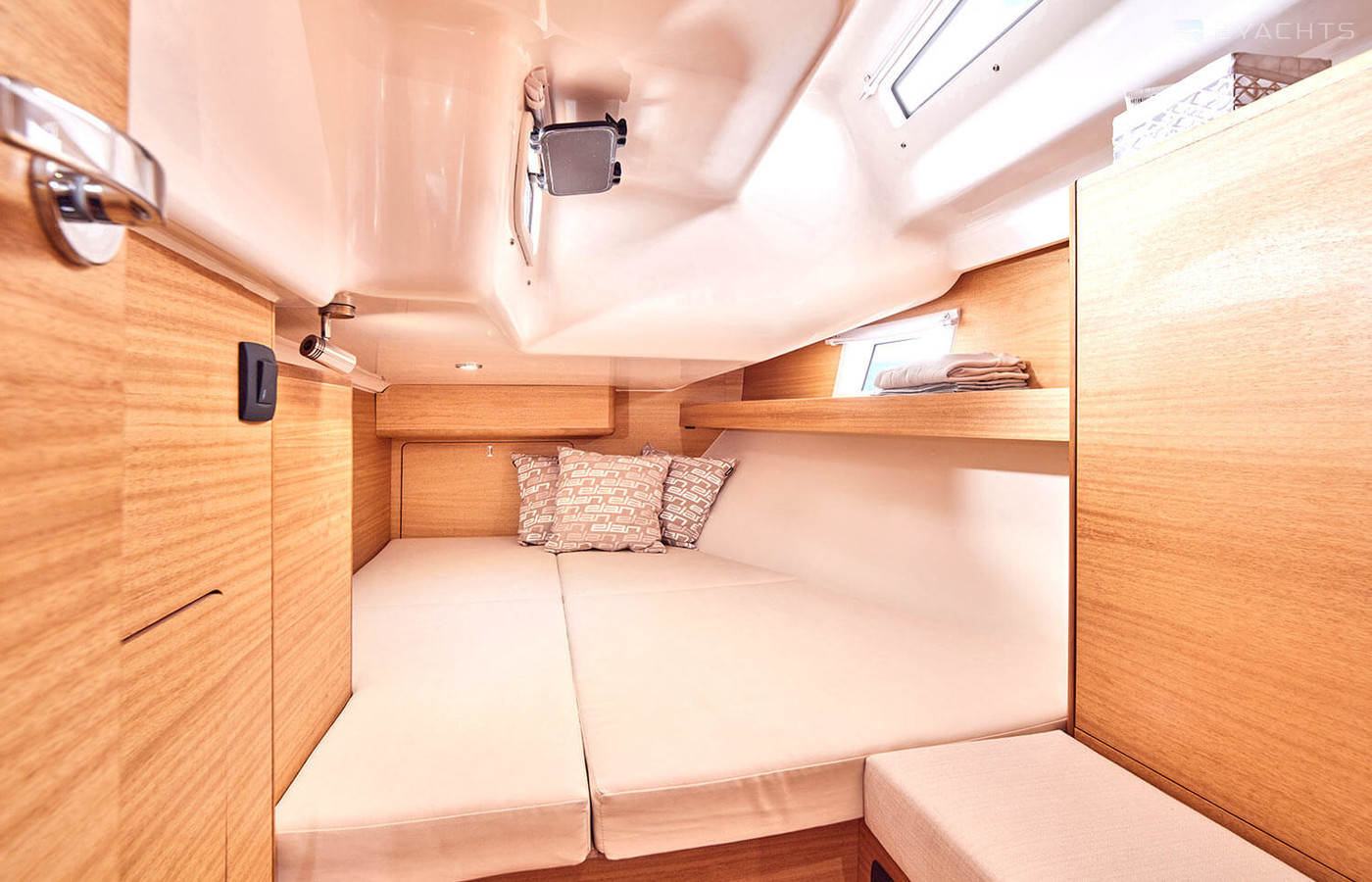 На корме лодки установлена складная купальная платформа с противоскользящим покрытием. Перед ней расположен рулевой пост. По бортам кокпита находятся угловые диваны с рундуками, для хранения спасательного оборудования или личных вещей. На крыше надстройки размещены панорамные люки, которые обеспечивают хорошее освещение салона яхты. Бортовые проходы оборудованы хромированными леерами и поручнями. В кормовой части нижней палубы расположено две каюты, оснащенные двухместными кроватями. По правому борту от них находится гостевой санузел. На миделе лодки находится камбуз, укомплектованный двухсекционной мойкой, отделениями для хранения посуды, СВЧ печью и вытяжкой. Мастер каюта оборудована собственным санузлом, двуспальной кроватью, гардеробом и ящиками для хранения постельного белья. По желанию заказчика в носовой части может быть добавлена еще одна одноместная каюта с собственным диваном и гардеробом.