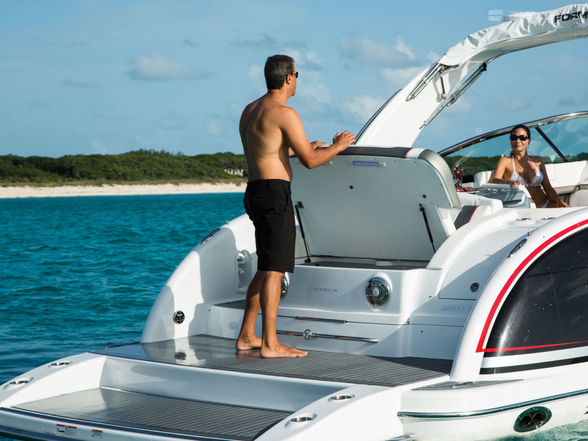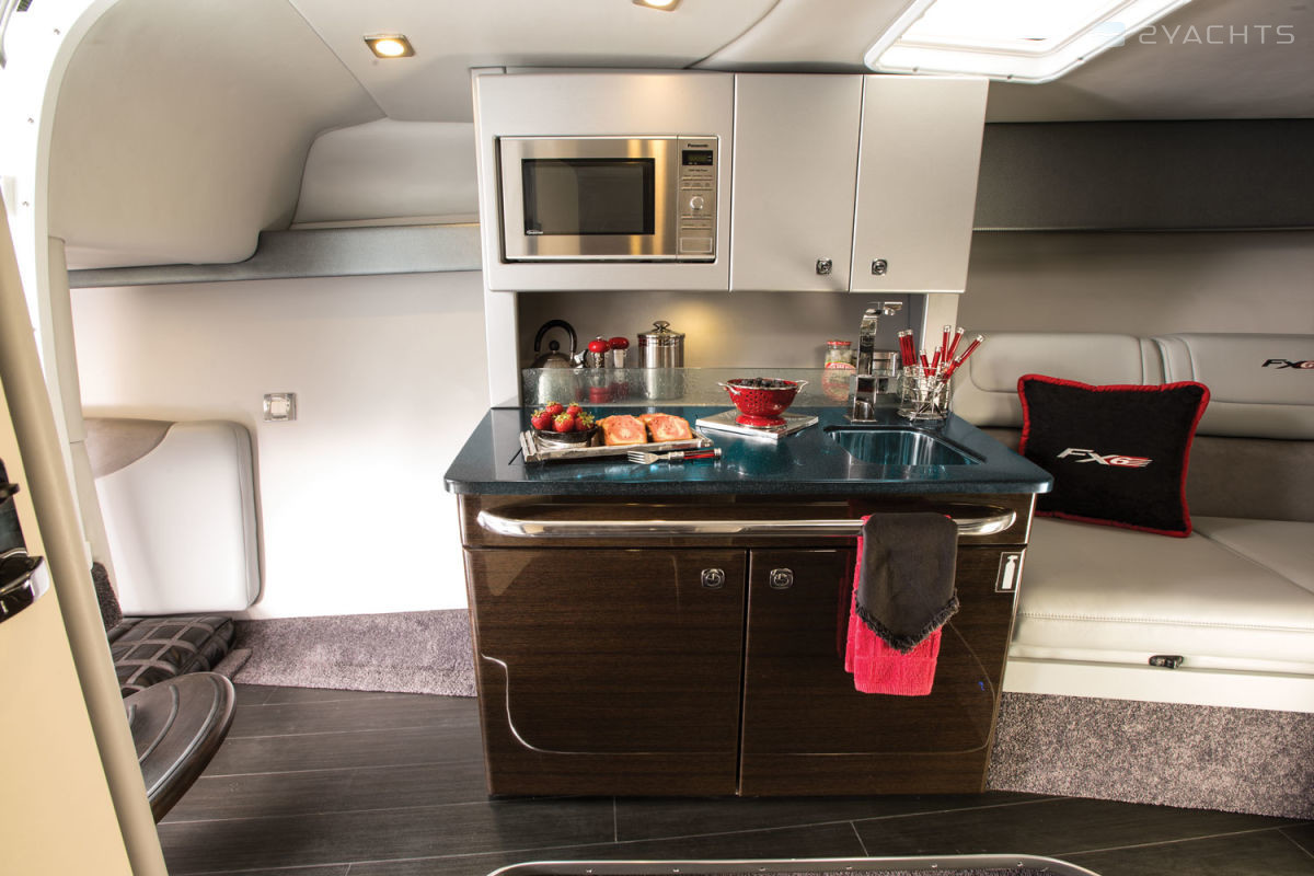 Стильный и яркий каютный круизер Formula 350 FX6 подойдет для длинных уикендов на воде. Функциональность и практичность здесь гармонично «упакована» в роскошный экстерьер — фирменная FX-графика и полиуретановые покрытия Imron обеспечивают лодке глянцевый блеск, который невозможно достичь при окраске лодки в гелькоуте. Кроме прочего, такое покрытие более долговечно. В оформлении кокпита мирно соседствуют элементы ретро и ультрасовременные мотивы. В деталях и отделке мебели применены композитные материалы, в том числе, углепластик. Каюта под носовой палубой обеспечит комфортный приют и все необходимое в путешествии — камбуз, душевую комнату и два двуспальных места.