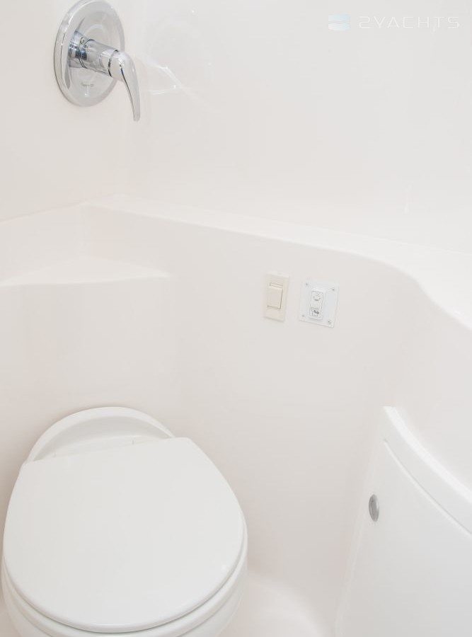Салон панорамно остеклен, в его носовой части расположены диваны, дополненные съемными валиками, кормовая зона оснащена полноразмерной кроватью. Кухня оборудована мойкой, электроплитой, телевизором и холодильником. Столешница может быть выполнена в трех разных цветах: Hazelnut, Moon Crystal, или Boardwalk.