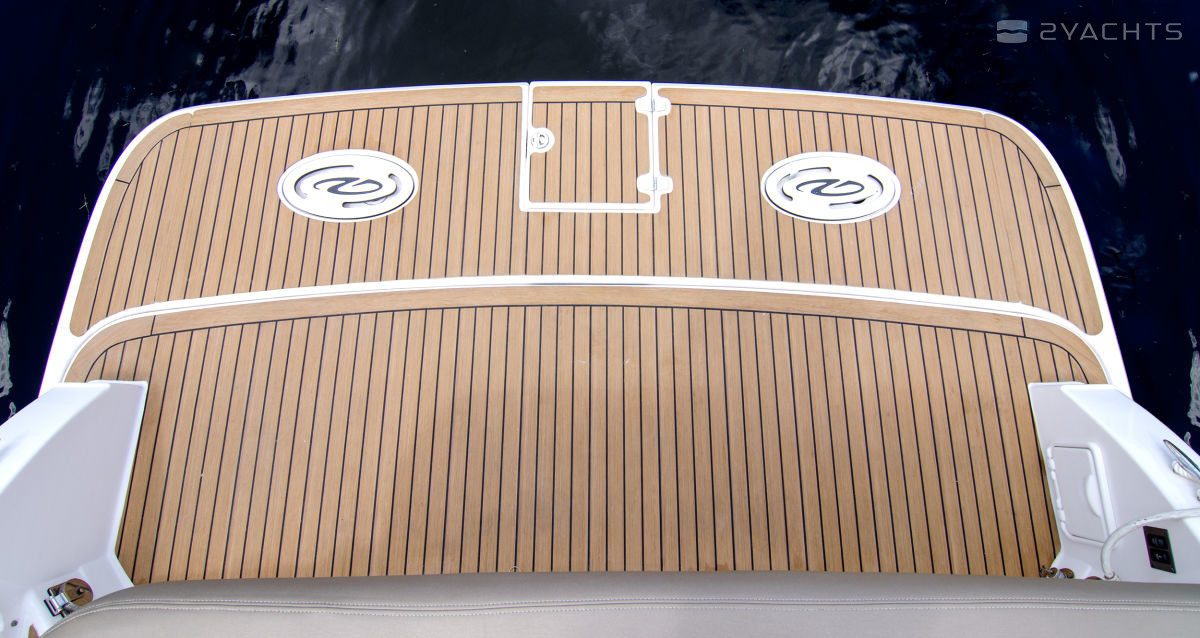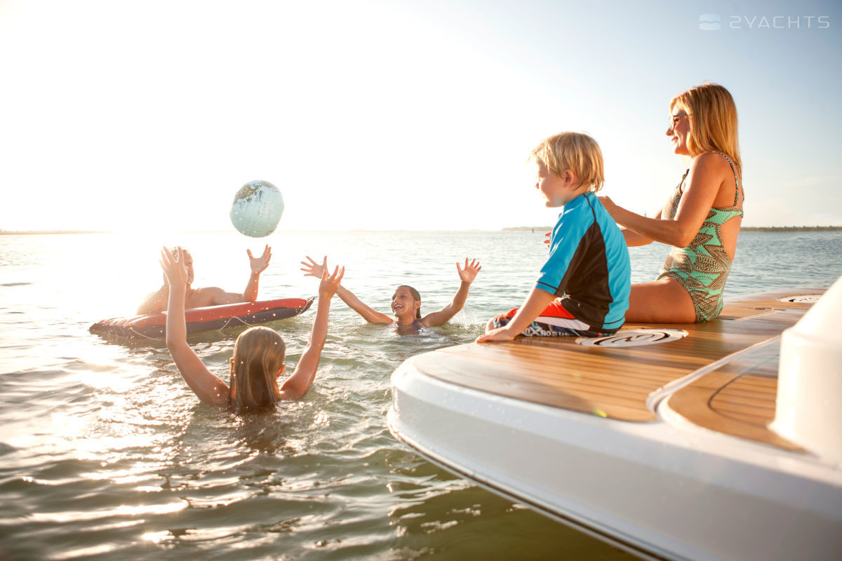 Опционально над купальной платформой можно установить хардтоп, в транце оборудован душ. В носовой части установлен мягкий лежак.