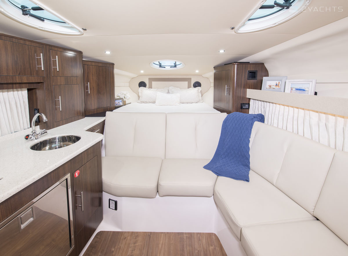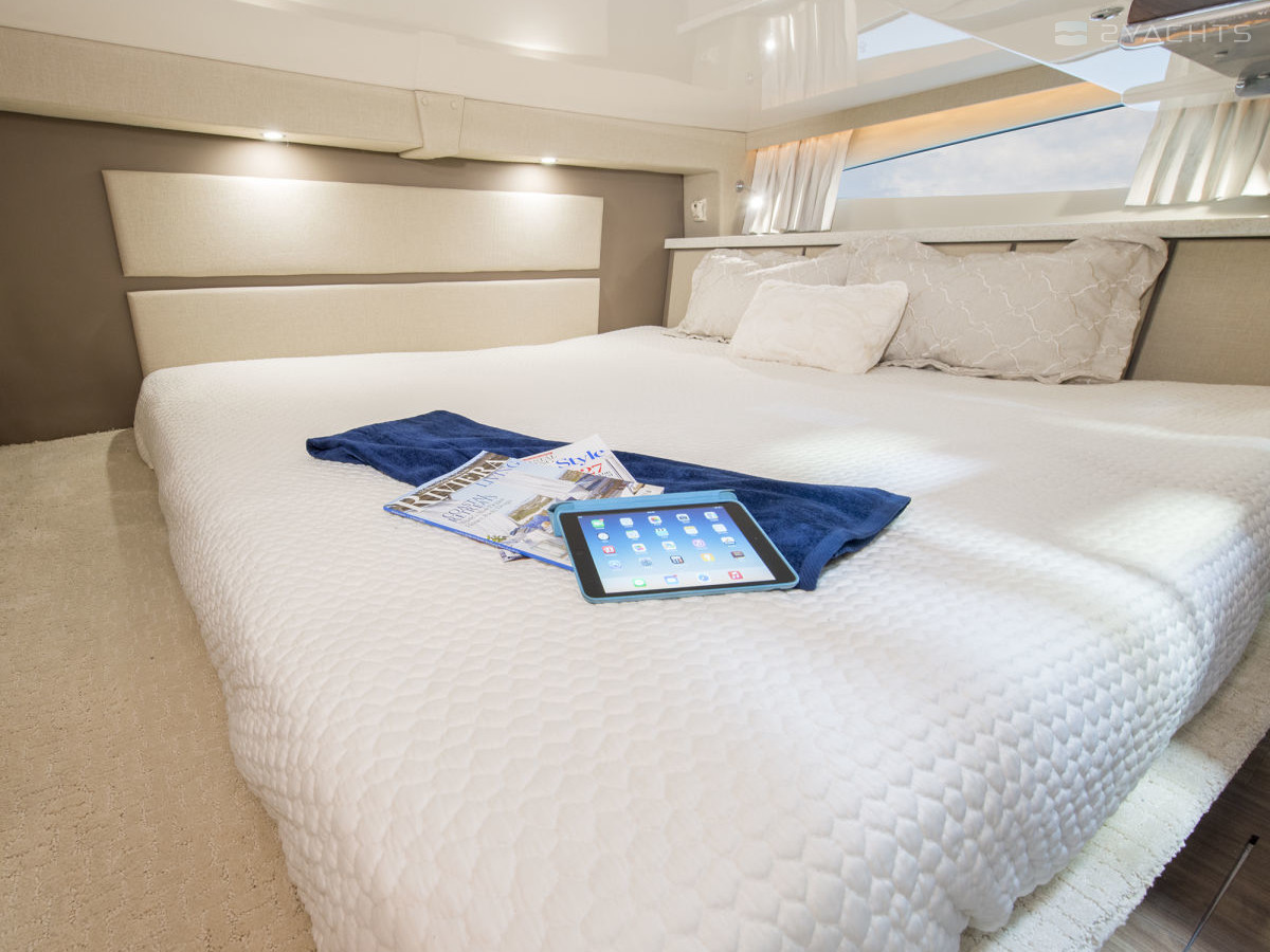 В кормовой каюте расположена двуспальная кровать, в носовой – трансформирующийся диван, на судне предусмотрен один санузел. Катер рассчитан на четыре спальных места для гостей, максимальная вместимость – до 11 пассажиров.