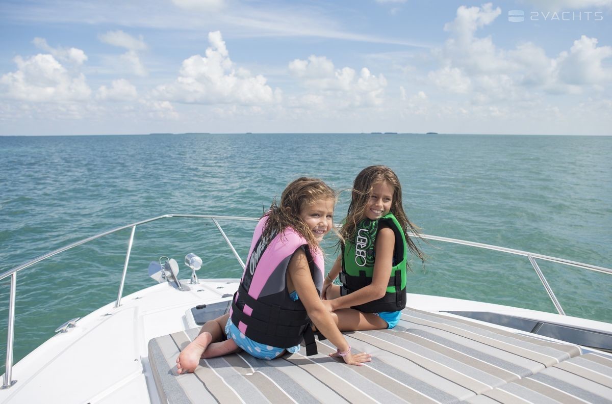 В кокпите установлен газовый гриль, телевизор и холодильник, вет-бар с раковиной и ящиками для хранения. На яхте увеличенная купальная платформа с подсветкой и трап из нержавеющей стали.