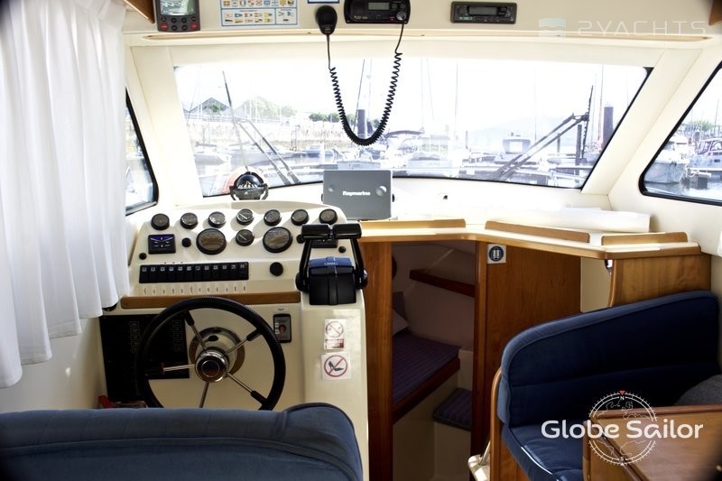 Яхту изготавливают из стеклопластика, композитных материалов, нержавеющей стали и закаленного стекла для остекления. Боковые проходы вокруг салона защищены высокими рейлингами, в носовой части расположена зона отдыха, на корме — плавательная платформа и лестница подъема на флайбридж. В салоне расположены столовая с динетт-зоной и пост управления, на нижней палубе — каюта, камбуз и санузел. Камбуз оснащен холодильником, кухонными принадлежностями, раковиной и плитой, санузел — душем и туалетом, каюта в носовой части, рассчитанная на двух человек — двуспальной кроватью, шкафом, зеркалом. На лодке два поста управления: на флайбридже и в кабине. Центральный пост управления на флайбридже защищен лобовым стеклом, оснащен сложными системами эхолокации, радаром и многочисленными креплениями для снастей, необходимыми для рыбалки.