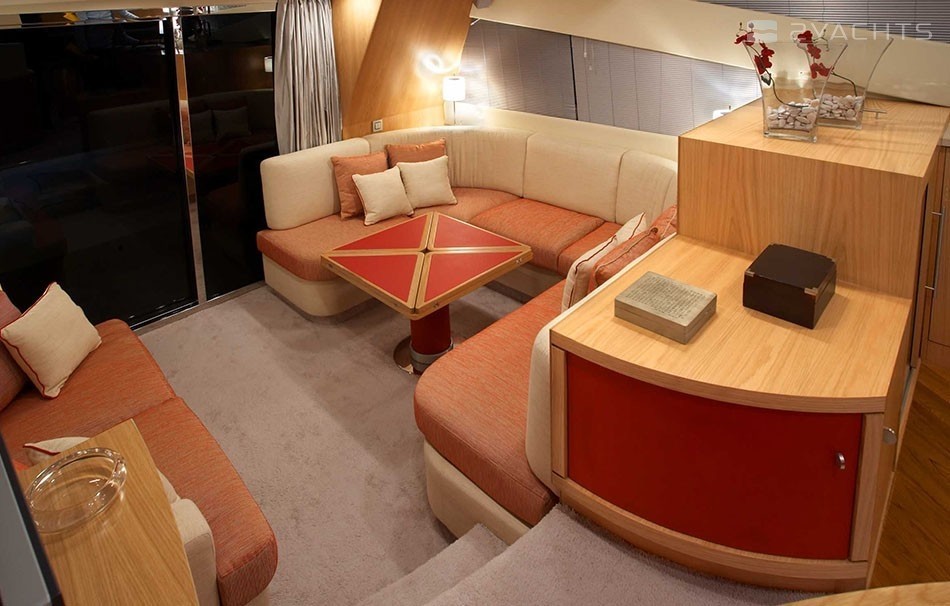 Флайбридж вмещает: лежаки для загара на носу, пост управления и двухместное кресло по правому борту, зону барбекю со столом, холодильником, раковиной и диваном на корме. Салон разбит на две части: пост управления и камбуз на возвышении, к обеденной зоне из раскладывающихся диванов и стола спуск по ступенькам. Выход отделен раздвижной дверью со шторками. На носу расположена зона для загара с мягкими лежаками, в кокпите — лестница для подъема на флайбридж, диван и выход на плавательную платформу. Пост управления оснащен автопилотом, GPS, эхолотом, носовым подруливающим устройством и радаром. Планировка нижней палубы представлена двумя санузлами, мастер-каютой в носовой части и двумя гостевыми каютами по бокам.
