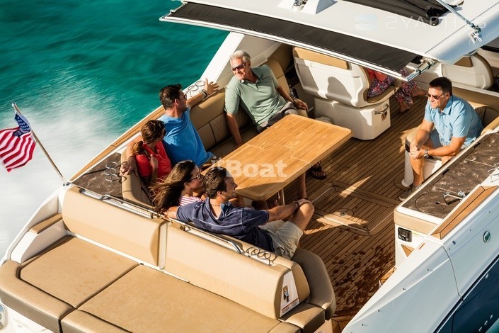Для отдыха предусмотрены лежаки на корме и сидения с подстаканниками в носовой части судна. Вы можете расширить палубу откинув специальную секцию правого борта, создав таким образом небольшую террасу с удобным доступом к воде. В салоне расположен пост управления, а также камбуз с баром, холодильником, раковиной и грилем. Пост управления получил 12 дюймовый динамический дисплей с сенсорным управлением. Подключив смартфон к бортовому компьютеру катера с помощью специального приложения, вы можете получать всю важную информацию о работе его систем, а также управлять освещением судна и его аудиосистемой. На нижней палубе катера расположены две гостевые каюты на четыре человека и санузел с душевой.